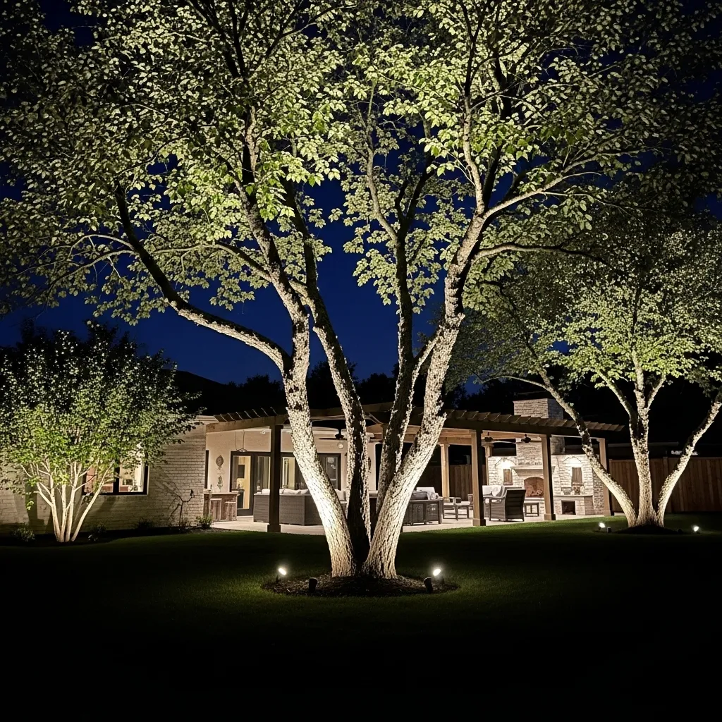 The key is strategic placement and appropriate intensity. Position uplights at the base of specimen trees—those with interesting bark, attractive branching, or beautiful canopy structure. Aim lights upward through the canopy, experimenting with placement to create the most attractive shadows and highlights. For architectural features—stone walls, pergolas, outdoor fireplaces, interesting fencing—position lights to graze surfaces, emphasizing texture and dimension. Use higher wattage for tall trees or large features—typically 7-15 watt LED fixtures depending on height and desired effect. Choose adjustable fixtures that allow you to aim and focus beams precisely. Ensure fixtures have appropriate shielding to prevent light spill and glare. The uplighting creates dramatic focal points that draw the eye and create depth, transforming your backyard into an illuminated landscape with layers of visual interest.