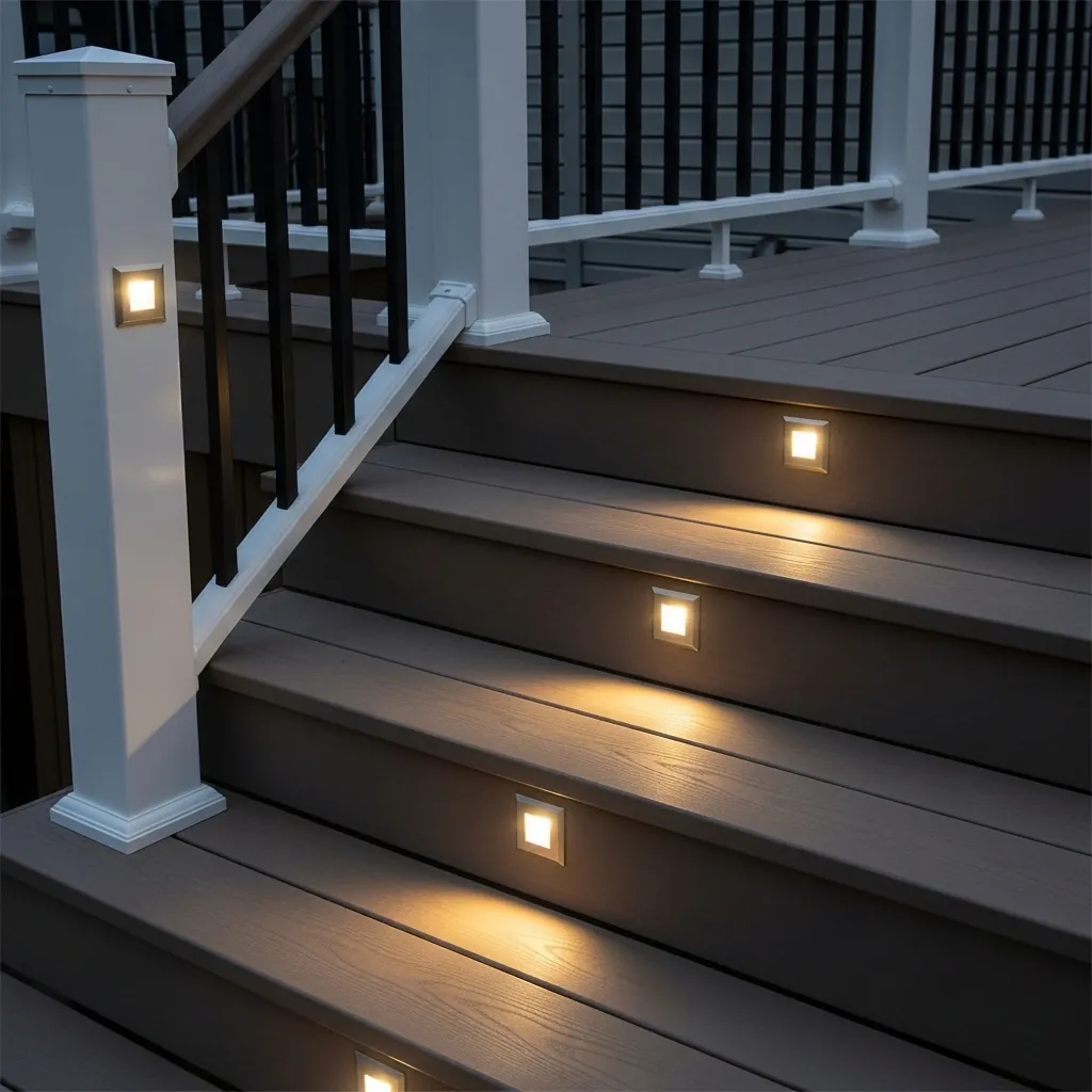 The key is planning recessed lighting during deck construction or retrofit installation, and placing fixtures strategically for function and beauty. Recessed step lights in each riser illuminate treads, preventing dangerous missteps—this is crucial safety lighting that prevents injuries. Recessed railing lights or post cap lights provide ambient perimeter lighting defining deck edges and creating gentle overall illumination. Consider recessed lights in deck boards themselves near seating areas for subtle ambient glow. Use low-wattage LED fixtures—typically 1-3 watts per fixture—providing adequate visibility without harshness. Choose fixtures with appropriate weather rating and finishes that coordinate with deck hardware. Connect to timers or photo sensors for automatic operation. The recessed lighting creates safety and ambiance while maintaining the clean lines and uncluttered appearance that makes decks attractive during daylight hours.