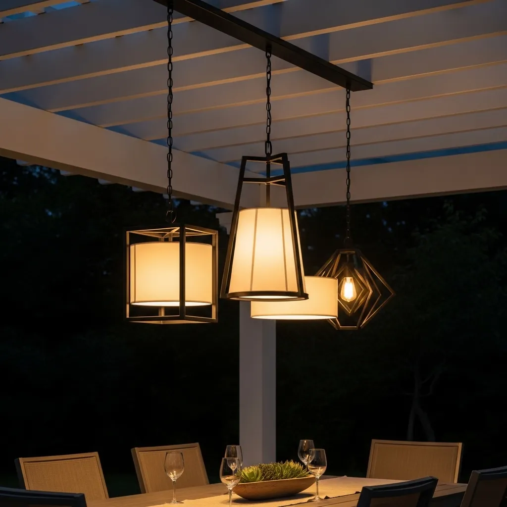 The key is selecting truly outdoor-rated fixtures and hanging them at appropriate height. Choose pendants specifically designed for outdoor use with weather-resistant finishes and sealed electrical components. Hang pendants 30-36 inches above the table surface—high enough to prevent head bumps but low enough to provide focused light and intimate scale. For rectangular tables, use multiple smaller pendants rather than one large fixture for better light distribution. Connect to dimmer switches allowing brightness adjustment for casual dinners versus entertaining. Choose styles that complement your outdoor aesthetic—metal lanterns for traditional, clean geometric shapes for modern, or rustic cage lights for farmhouse style. The pendant lighting creates a defined dining zone and provides the focused illumination that makes outdoor dining practical and pleasant well after sunset.