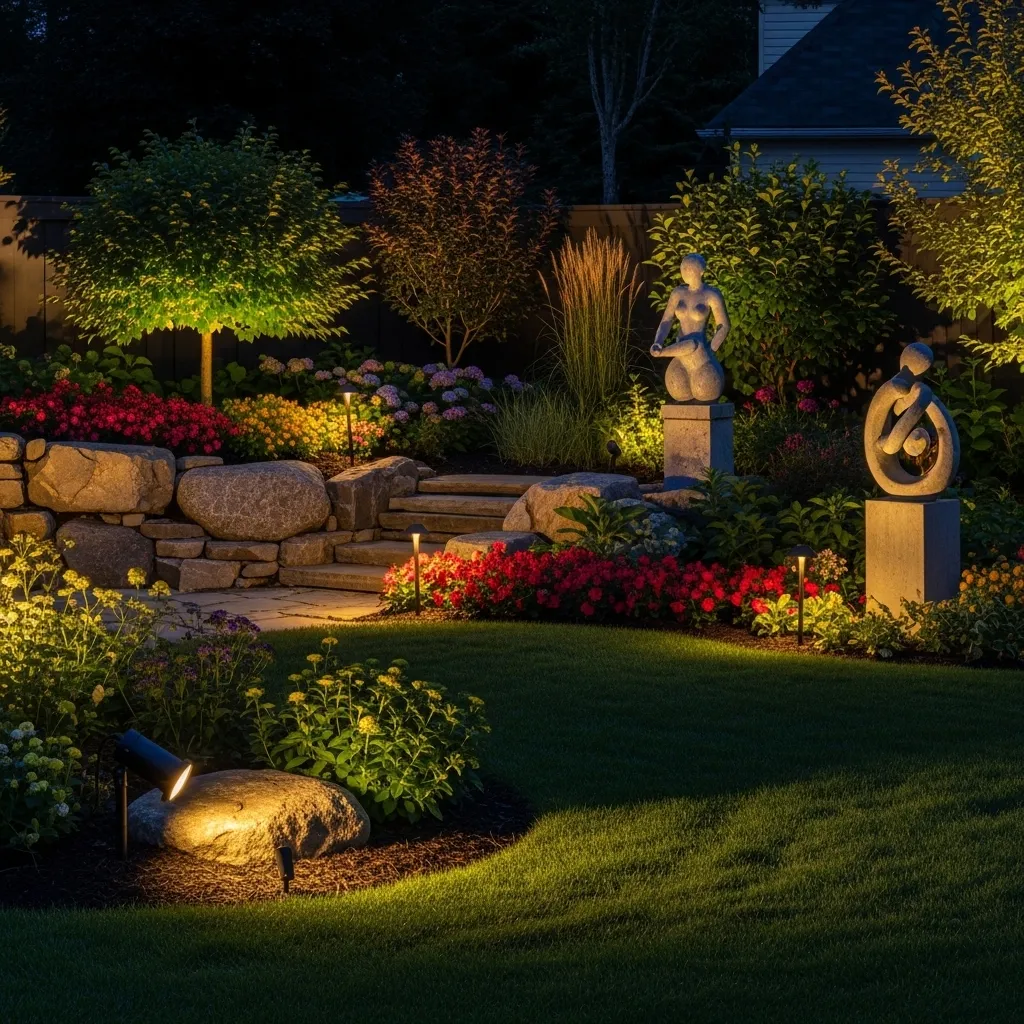 The key is strategic selection of what to illuminate and proper aiming for maximum effect. Identify focal points worth highlighting—specimen plants with interesting form or color, garden art or sculptures, water features, attractive boulders or hardscape elements, flowering beds at peak bloom. Use adjustable spot lights allowing you to aim and focus beams precisely. Experiment with placement and angle—light from the side creates dimension and reveals texture, light from front creates flat illumination. Use narrow beam angles (typically 15-30 degrees) for small features like sculptures, wider beams (35-60 degrees) for larger plantings or areas. Vary wattage based on feature size and distance—typically 3-7 watt LED fixtures work for most applications. The selective spotlighting creates a curated, theatrical landscape with depth and drama that guides the eye to your most beautiful elements.