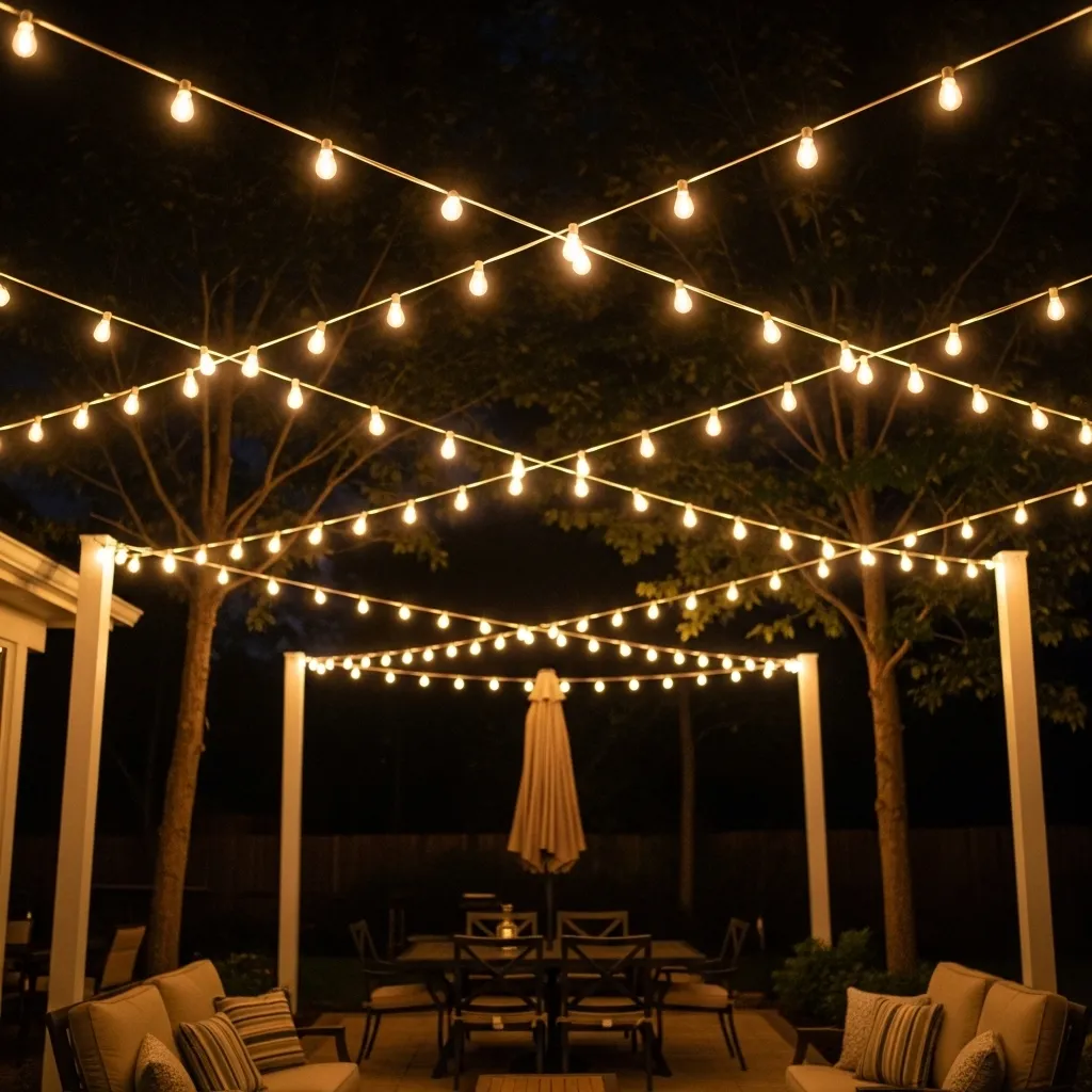 The key is hanging lights thoughtfully at varied heights rather than just stringing them straight across. Crisscross patterns create visual interest and ensure even light distribution. Drape lights in gentle swags between mounting points—poles, pergola beams, tree branches, or dedicated posts—creating graceful curves rather than tight, straight lines. Use commercial-grade outdoor string lights rated for weather exposure with LED bulbs for energy efficiency and longevity. Warm white (2700-3000K) creates the most inviting, flattering glow. Consider dimmable options or connect to timers so lights automatically illuminate at dusk. String lights work beautifully over dining areas, lounge spaces, or entire patios, creating festive yet intimate atmosphere that encourages lingering outdoors long after sunset.