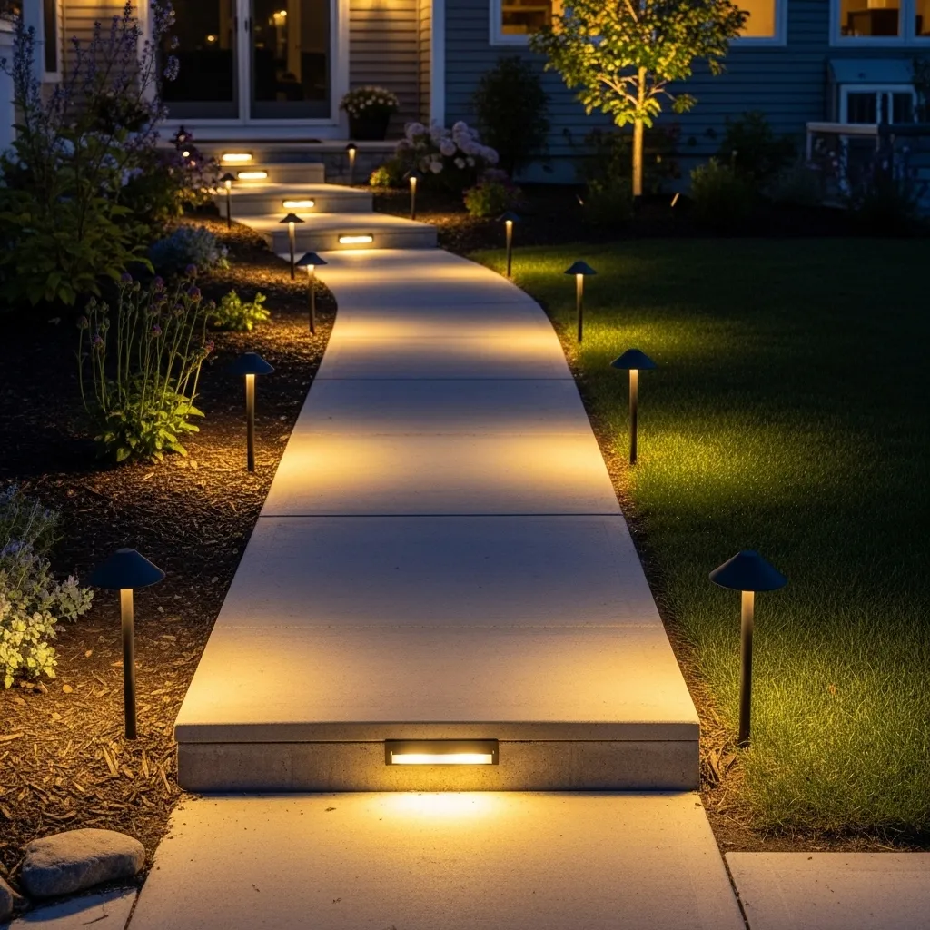 The key is appropriate spacing and fixture selection that provides adequate light without being harsh or overwhelming. Position lights every 6-8 feet along paths—closer spacing for curved paths or areas with obstacles, wider spacing for straight, clear routes. Choose fixtures that direct light downward onto the path surface rather than upward into eyes—bollard lights with downward shields, mushroom-style fixtures, or low stake lights work well. Match fixture style to your home’s aesthetic—modern, traditional, or transitional designs are all available. Use consistent finish throughout—bronze, black, copper, or stainless steel. Ensure adequate brightness for safety—typically 3-5 watt LED fixtures provide sufficient illumination—but avoid overly bright lights that create harsh spots. Illuminate steps particularly well as they’re common accident points. The pathway lighting creates safe navigation while adding beautiful layers of low-level illumination to your landscape.