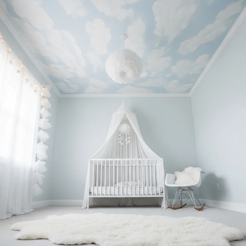 A hand-painted cloud ceiling is one of the most magical things you can do in a nursery — and it’s more accessible than it sounds because you don’t need to be an artist. The technique involves a slightly darker blue base, then layered white paint applied with a sea sponge in organic cloud shapes, and the beauty of it is that imperfection is actually what makes it look real and dreamy rather than painted.