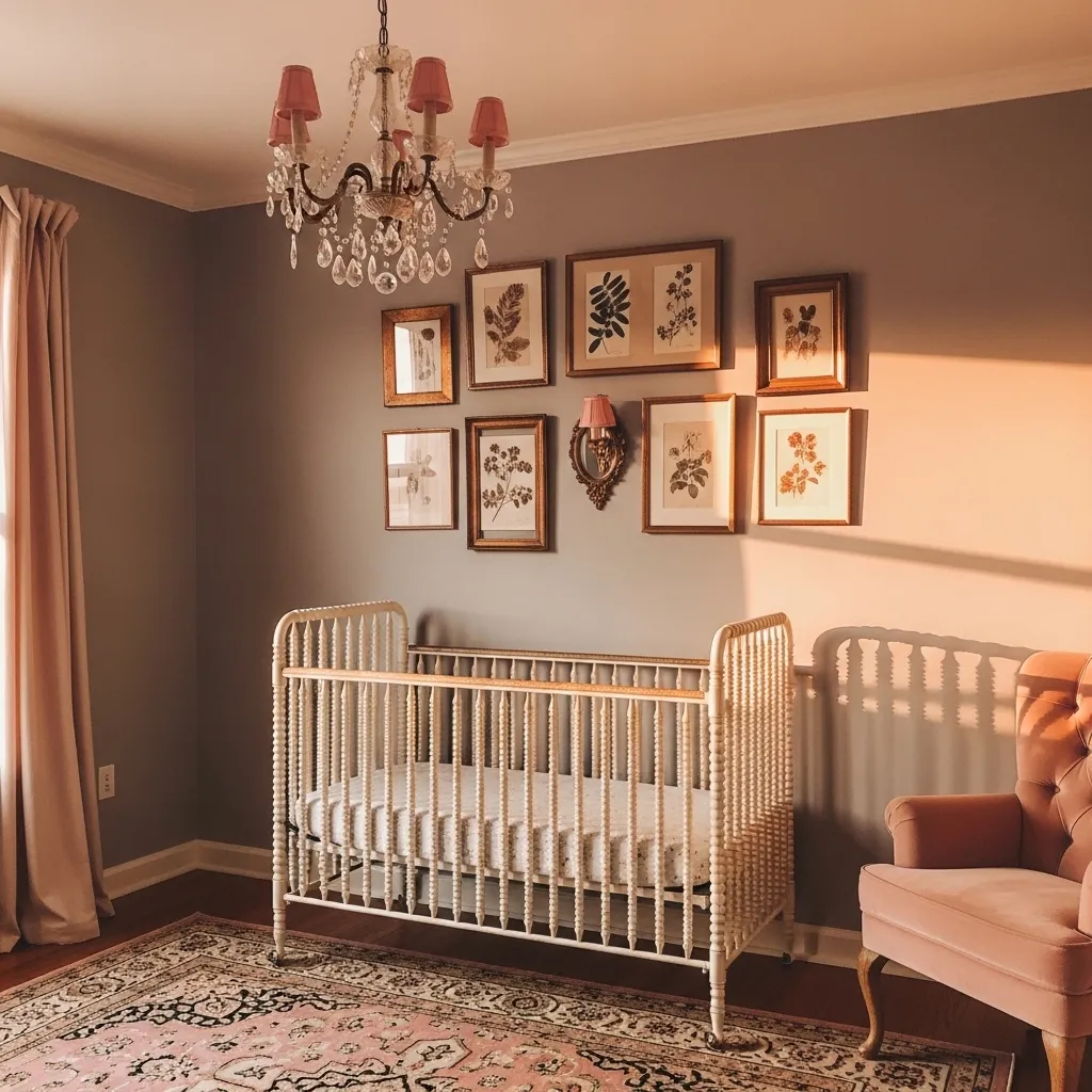The gallery wall above the crib is the detail that makes this idea feel really special — antique gold frames with botanical prints or soft watercolor artwork create a collected, heirloom quality that grows beautifully with the child. Unlike themed nursery art that becomes dated quickly, botanical and watercolor prints in classic frames feel appropriate for a baby, a toddler, and a school-age girl equally well.
