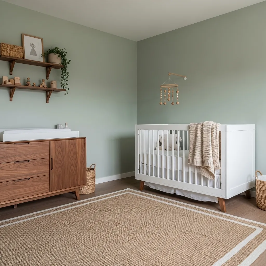 9. Soft Sage Green Nursery With Wooden Accents