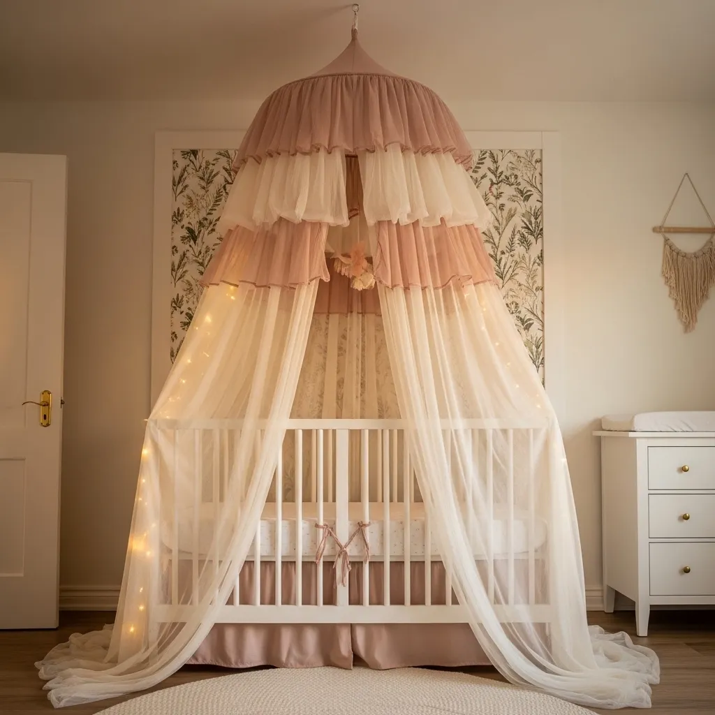A canopy over the crib is one of the most transportive nursery additions because it creates a physical sense of enclosure and magic around the baby’s sleep space — and it photographs like something out of a fairytale. Sheer tulle or linen in ivory and blush layers beautifully and catches light in a way that makes the whole corner of the room feel soft and glowing.