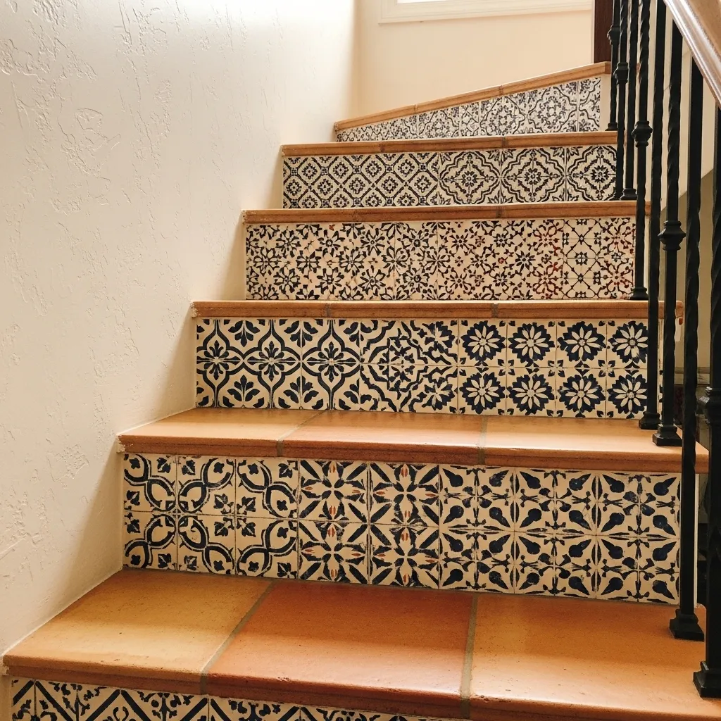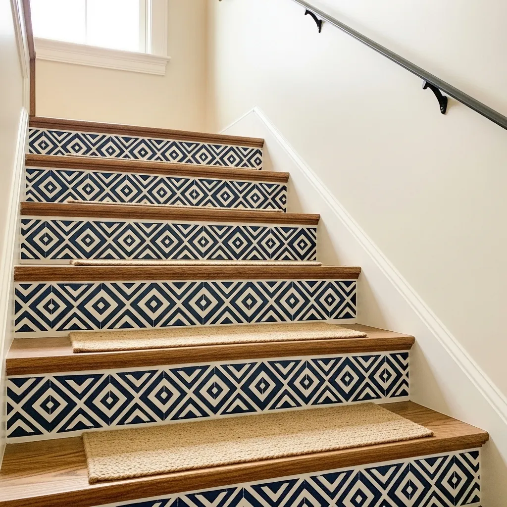 Stenciled tile-effect risers are the painted riser concept taken to its most decorative, artisan-inspired conclusion — each step becomes its own tiny work of art, and together they create the effect of hand-painted Portuguese or Moroccan tiles that would cost a fortune to actually install. The stenciling technique is patient work but genuinely achievable, and the result is something completely unique to your home.