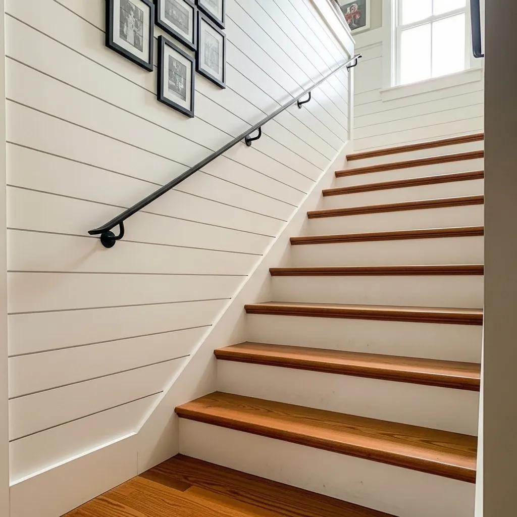 Shiplap on a staircase wall brings in that instant warmth and texture that flat-painted walls simply can’t achieve — the shadow lines between the boards create a subtle depth and rhythm that makes the wall feel alive and interesting even in a very neutral palette. Painted white, it reads as clean and fresh; left in a natural wood tone, it adds rustic warmth; painted in a color, it becomes a genuine statement.