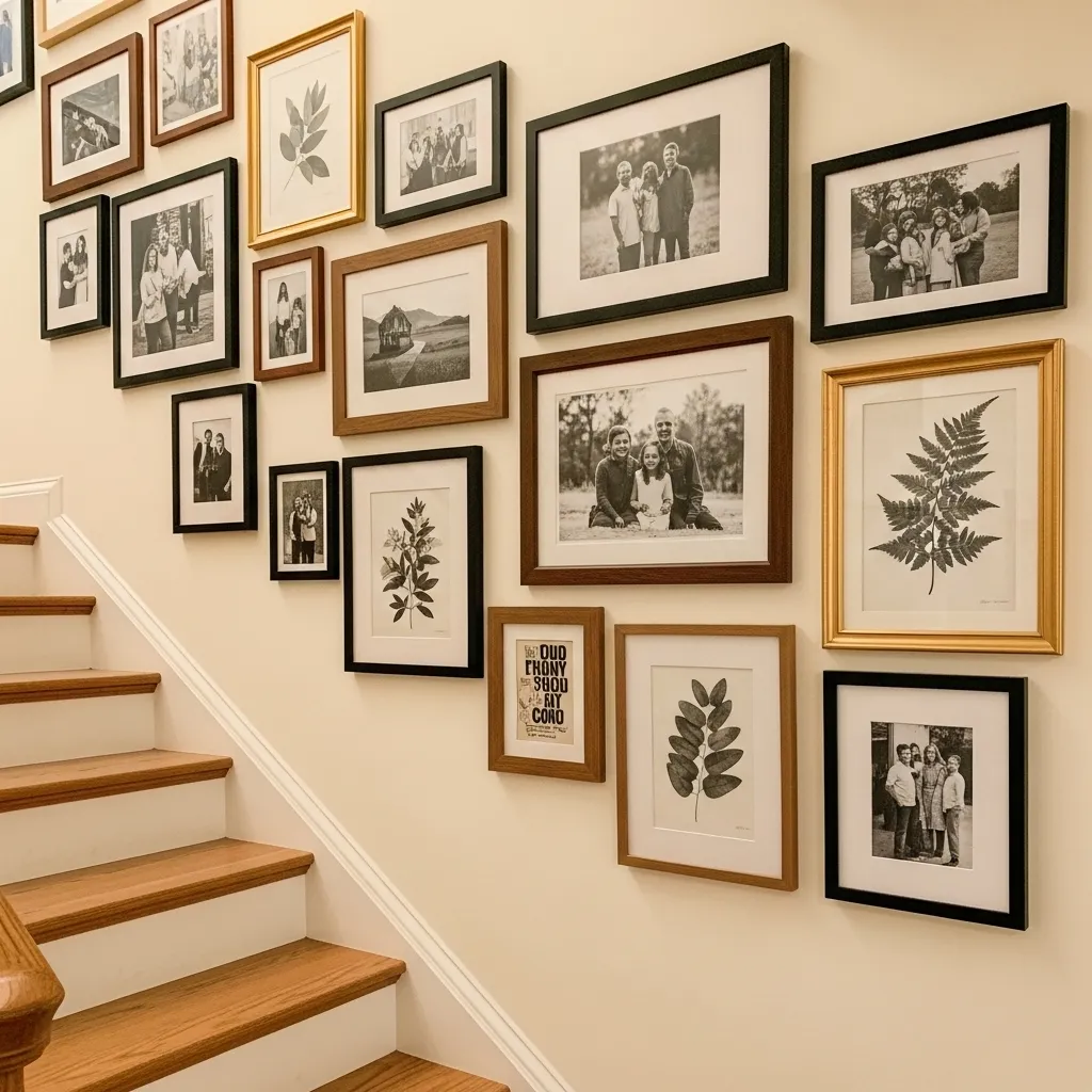 The key to a staircase gallery wall looking intentional rather than chaotic is establishing a cohesive element that ties all the frames together — whether that’s a consistent color palette in the artwork, a consistent frame finish, or a mix of both. Following the diagonal line of the staircase with your frame arrangement rather than fighting it is the compositional move that makes the whole thing feel designed rather than randomly hung.