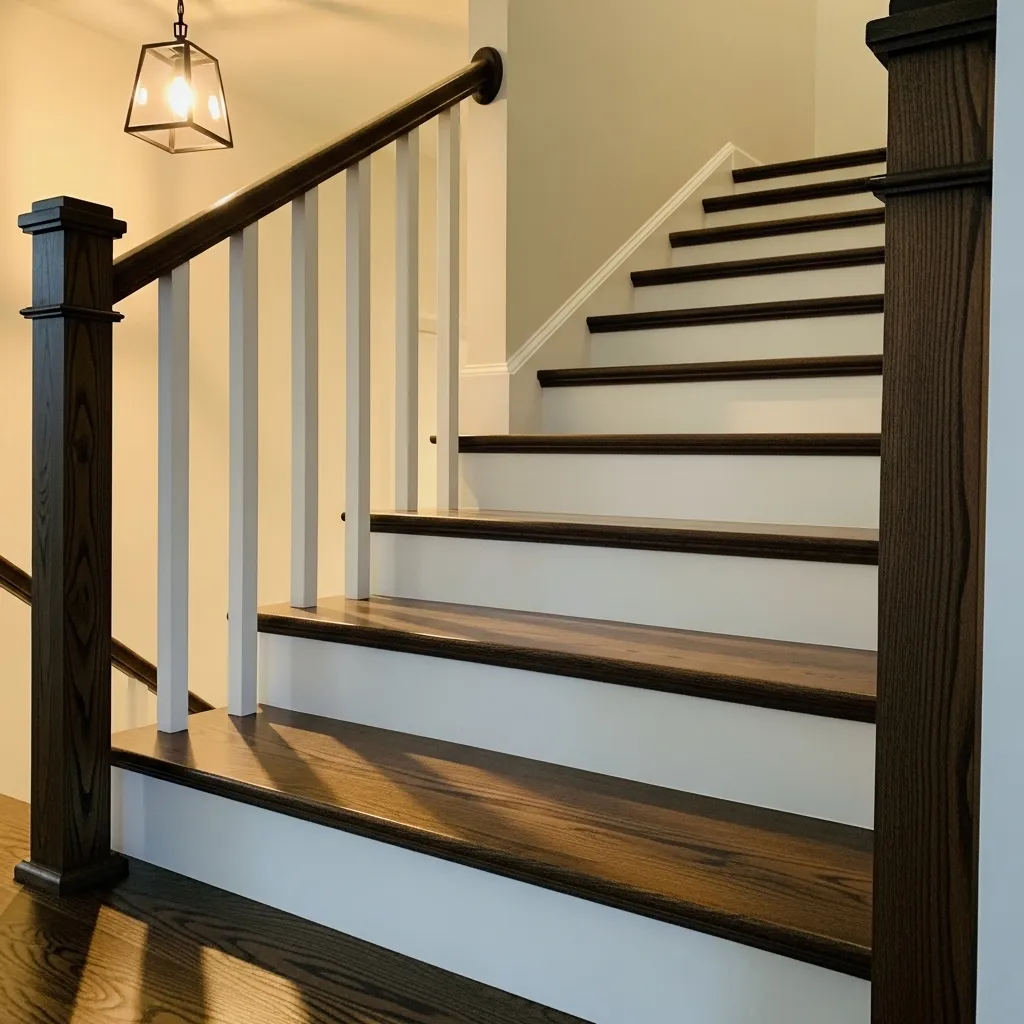 If your existing treads are in reasonable condition, refinishing them in a dark stain is a relatively accessible project — sanding, staining, and sealing takes a weekend of work but the result looks like a complete renovation. Pair the dark treads with white everything else — risers, balusters, wall — and the staircase becomes the most sophisticated space in the house almost overnight.