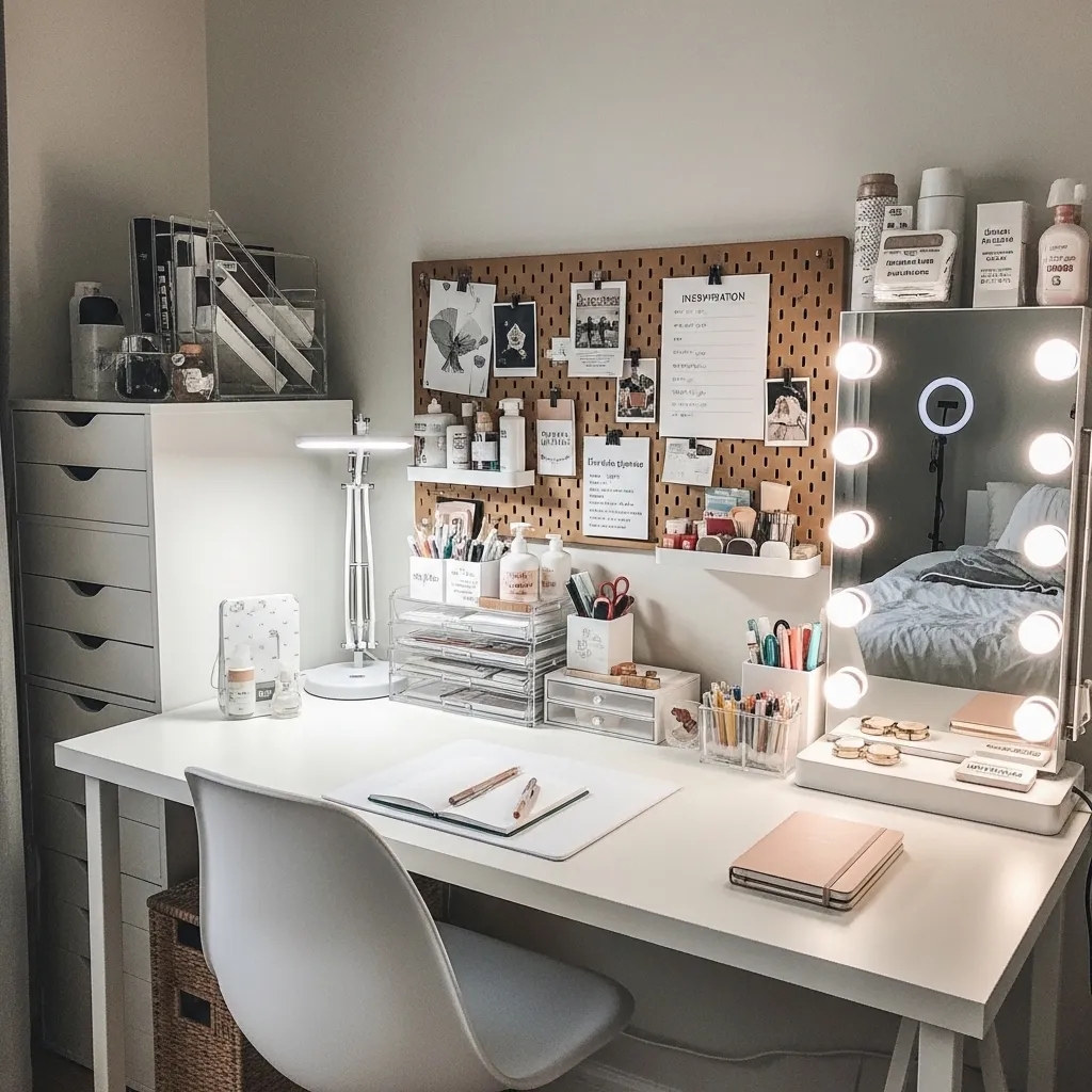 The key is selecting furniture matching your aesthetic and organizing with discipline. Choose a desk appropriate to your style and space—minimal Scandinavian desk, vintage writing desk, modern acrylic desk, or repurposed table. Organize with aesthetic storage—matching desk organizers, pretty pen holders, coordinating file boxes. Display only essentials and beautiful items—aesthetic notebooks, plant, inspirational print, quality desk lamp. Create an inspiration board using corkboard, pegboard, or magnetic board displaying photos, quotes, and goals in organized, aesthetic arrangement. Include good task lighting—modern desk lamp, ring light, or clip-on light in coordinating finish. For vanity setups, add a mirror with lighting and organize makeup and skincare in aesthetic containers. Keep the surface mostly clear—put away items after use rather than allowing permanent clutter. The functional workspace becomes a beautiful, inspiring area rather than a cluttered eyesore.