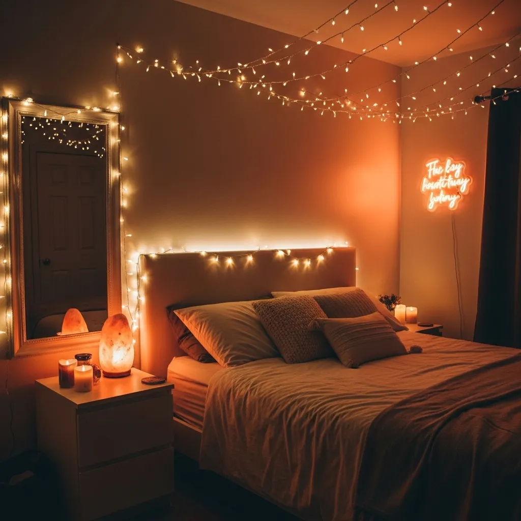 The key is layering decorative lighting that creates atmosphere rather than just function. Add string lights or fairy lights—drape across ceilings, wrap around bed frames, outline mirrors, or hang in curtains creating magical twinkle. Install LED strip lights behind headboards, under beds, or along shelves for modern glow effects—choose warm white or customize colors matching your aesthetic. Include table lamps with aesthetic bases and warm bulbs on nightstands or desks. Add candles (real or LED) in coordinating holders for flickering ambient light. Consider a neon sign with a word or phrase that resonates with your aesthetic. Avoid harsh overhead lighting—use it minimally or install dimmer switches. The layered, warm lighting creates cozy ambiance perfect for aesthetic photos and actual living.