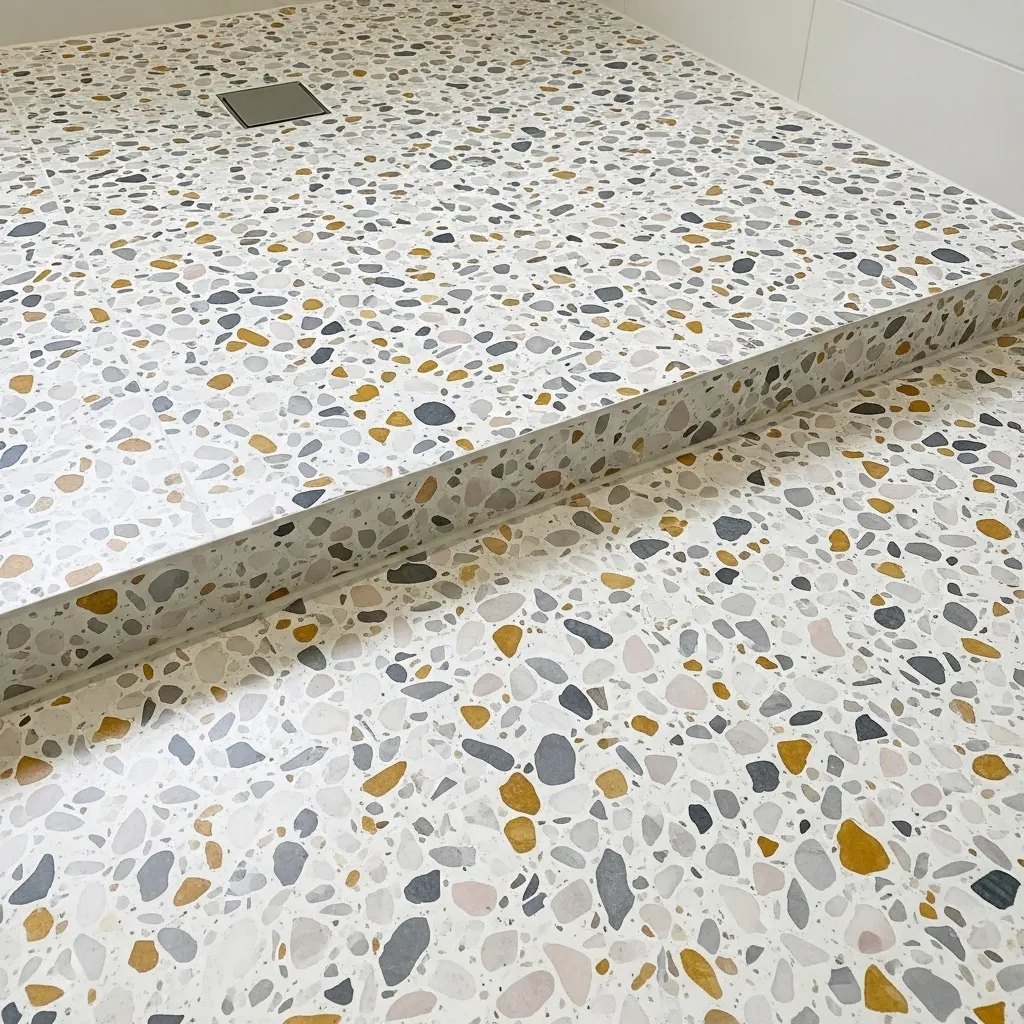 The warm aggregate palette is the 2026 specification that most distinguishes contemporary resin terrazzo from the institutional grey-and-white terrazzo of previous decades — by selecting aggregates in warm grey, gold, blush, cream, and natural stone tones rather than the cool grey and white of standard terrazzo, contemporary bathroom terrazzo creates a floor with the warmth and organic quality of natural stone while maintaining the compositional control and seamless surface that sets it apart from natural stone installation. The aggregate selection can reference the specific color story of the broader bathroom — a gold aggregate that echoes brass fixtures, a blush aggregate that connects to the wall color, a grey aggregate that bridges the vanity and floor tones — creating a floor that’s materially integrated with the room rather than independently chosen.