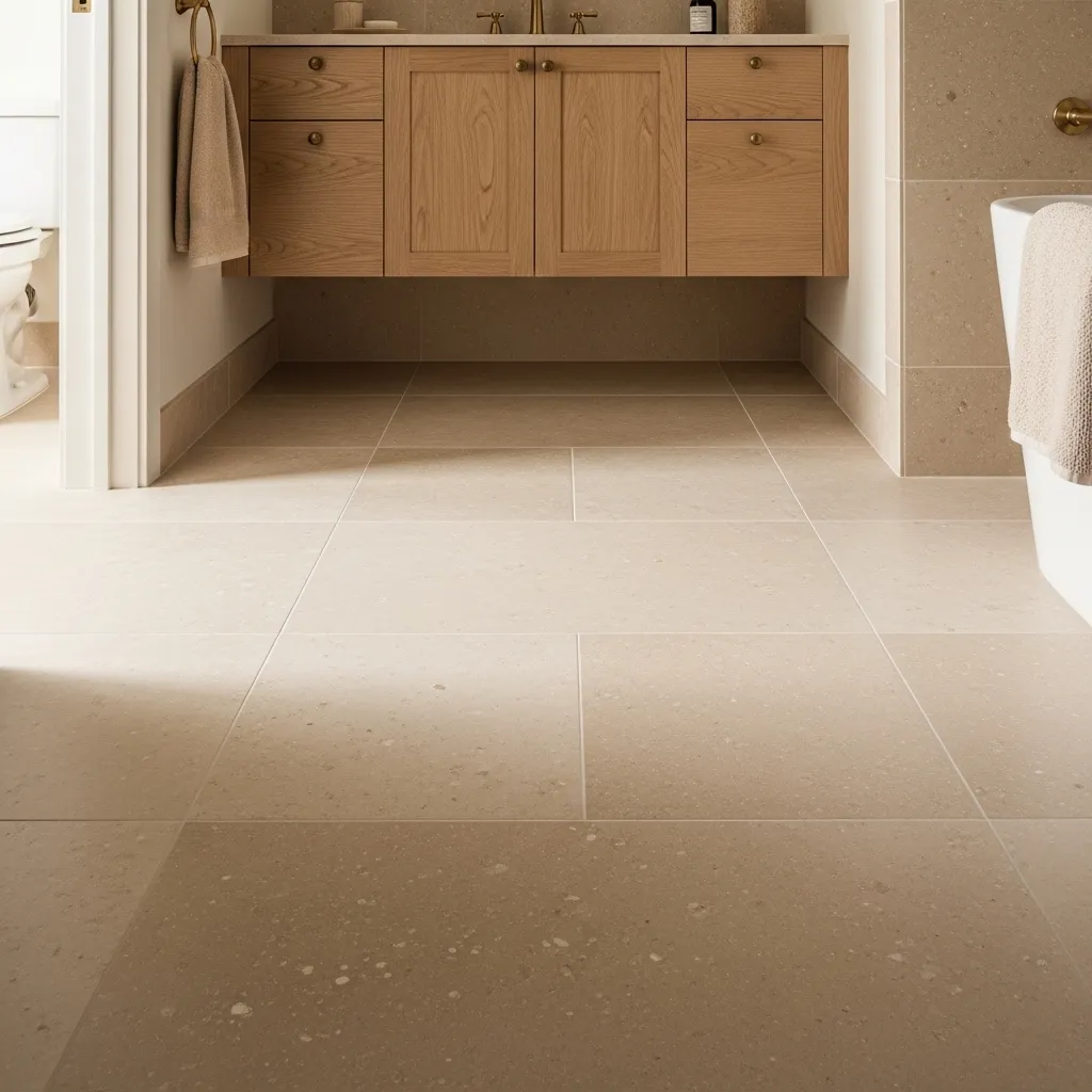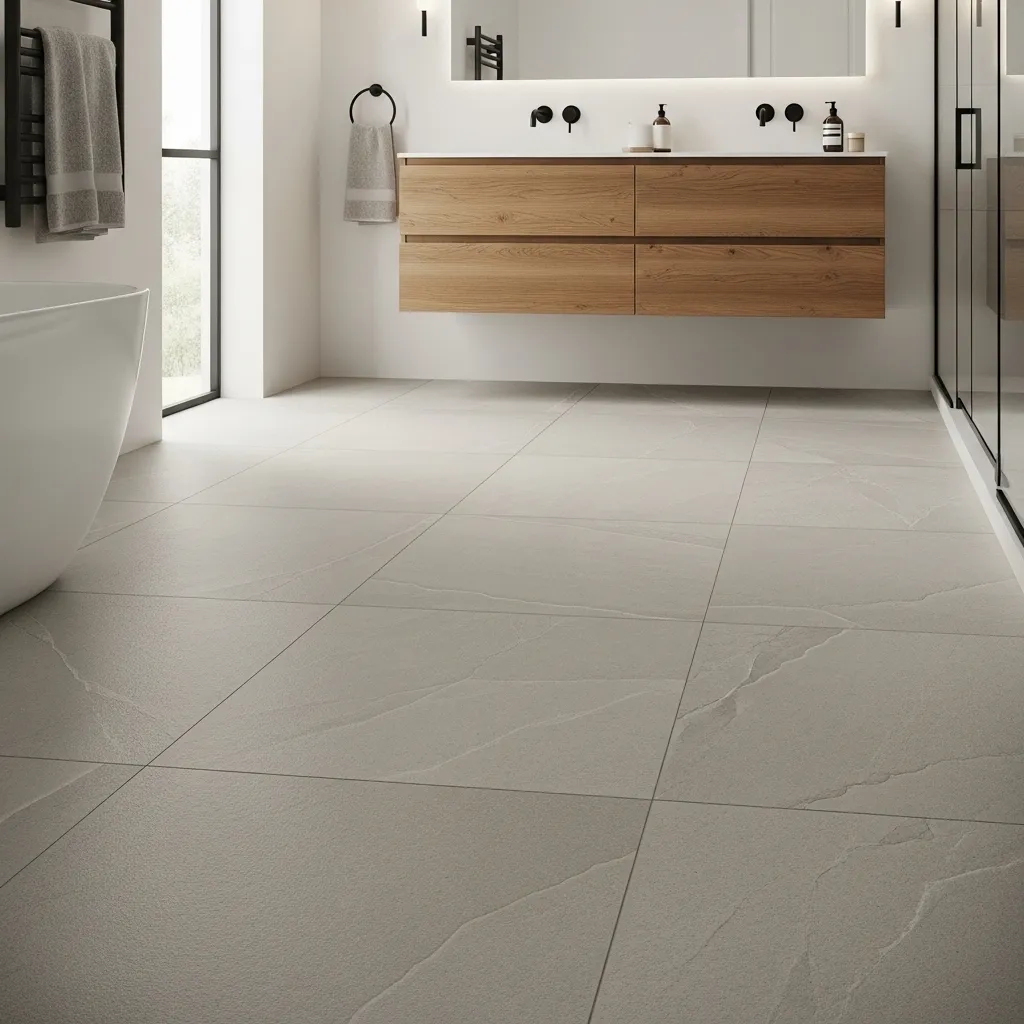 The surface texture on large-format porcelain is the 2026 specification detail that most distinguishes current bathroom floor design from the previous period’s preference for highly polished or completely smooth large-format surfaces — the textured surface references natural stone, reduces the slipping risk that polished large-format tile creates in wet environments, and creates a floor that interacts with light in a more complex and more beautiful way than a smooth surface. The slight relief of the texture creates micro-shadows that give the floor apparent depth and warmth even in flat, even light.