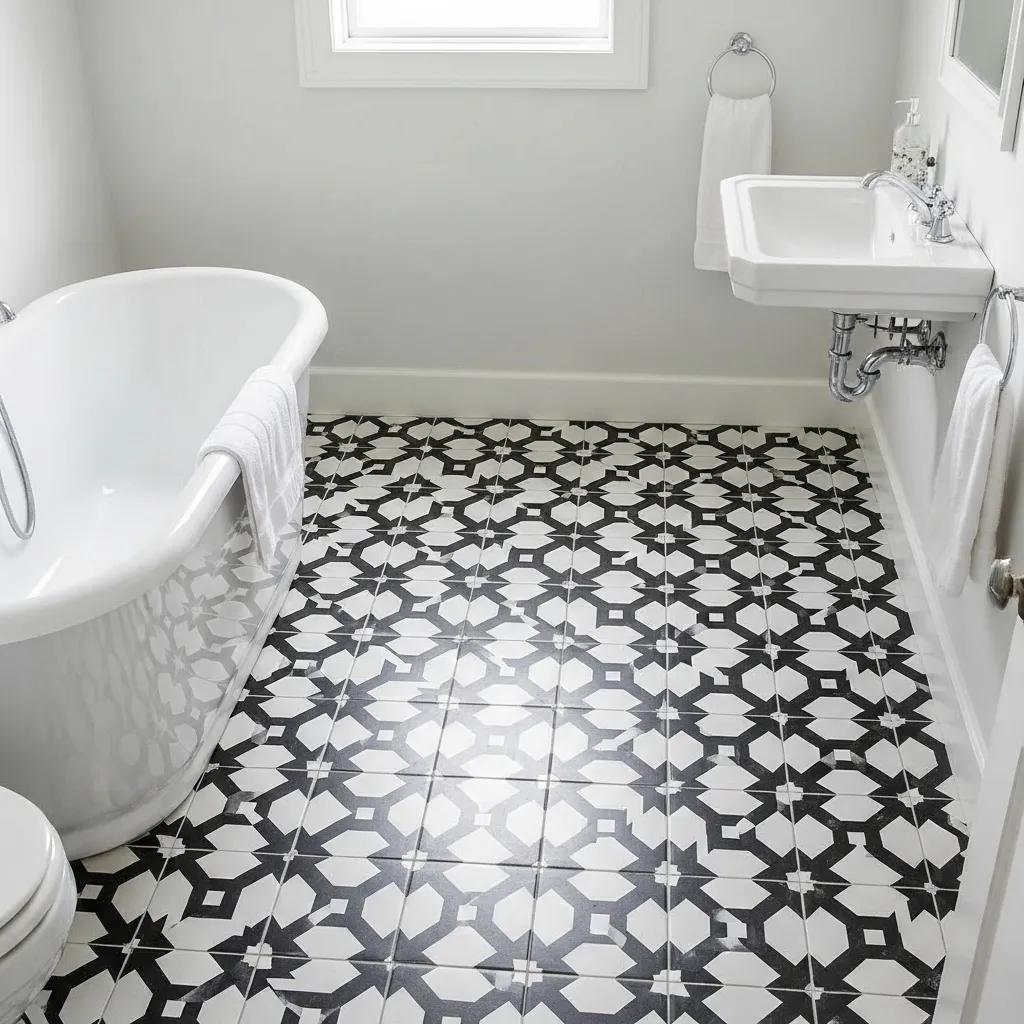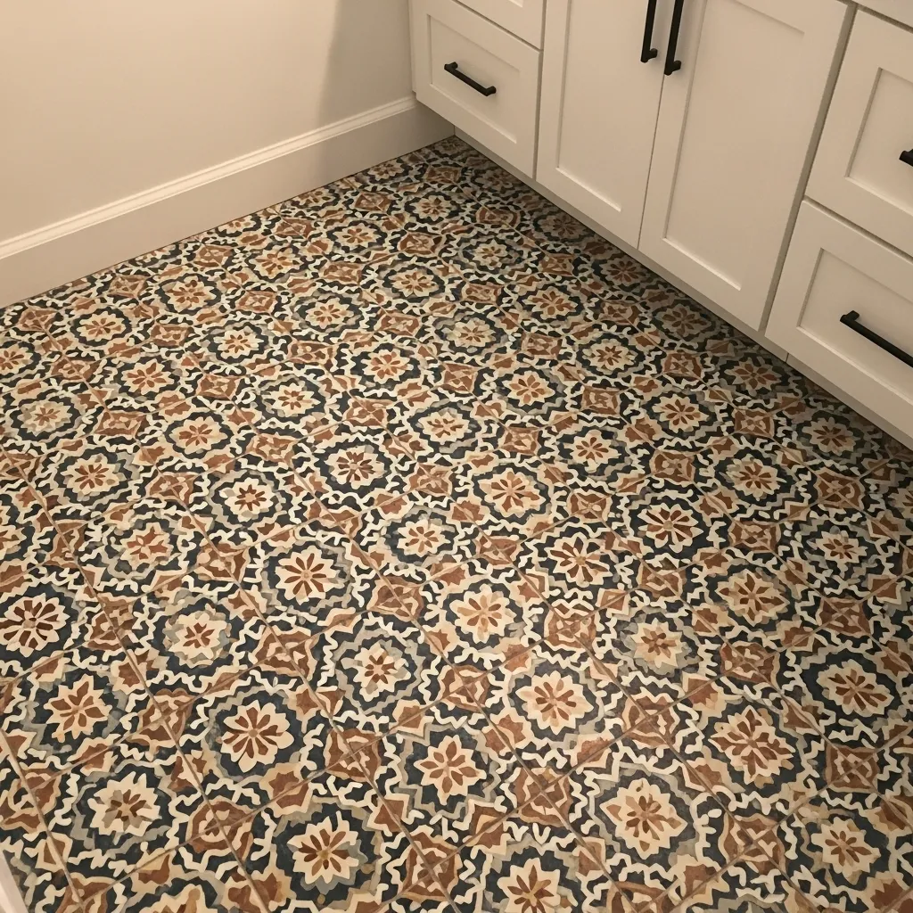 Encaustic cement tile — hydraulically pressed tiles with color and pattern inherent in the tile body rather than applied as glaze — creates the bathroom floor with the most complex visual beauty and the most specific historical character available, because the encaustic tile tradition spans centuries of production in Mediterranean, Middle Eastern, and Latin American craft traditions, and contemporary encaustic tiles made in those same traditions carry all the accumulated refinement of that long production history. The pattern complexity of a well-designed encaustic tile floor — where the individual tile is one element of a repeating pattern that only reveals its full complexity when multiple tiles are seen together — creates a floor that rewards sustained attention and that never quite resolves into the completeness of a simpler surface.