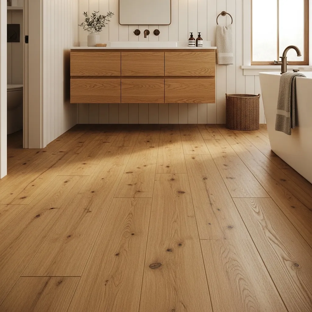 Warm wood-effect luxury vinyl flooring in a bathroom is the 2026 answer to the longstanding desire for wood floors in bathrooms — a desire that genuine timber cannot satisfy because of the moisture, temperature variation, and humidity that bathroom environments create. Contemporary luxury vinyl in high-quality wood-effect finishes has reached a level of visual and tactile realism that makes the best versions genuinely difficult to distinguish from real timber at normal viewing distances, and the performance characteristics of luxury vinyl — completely waterproof, dimensionally stable in temperature and humidity fluctuations, soft underfoot, warm to the touch — are specifically suited to the bathroom environment in a way that real timber isn’t.