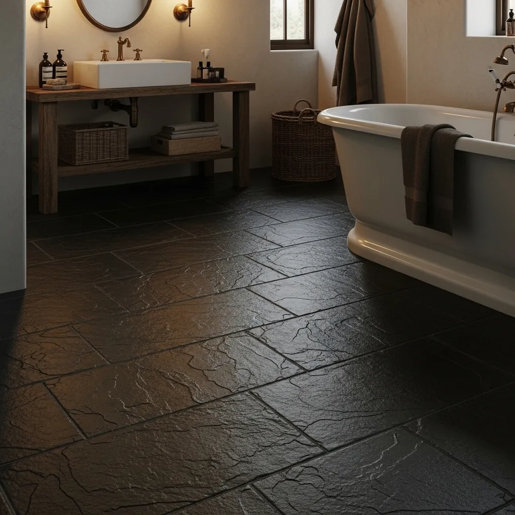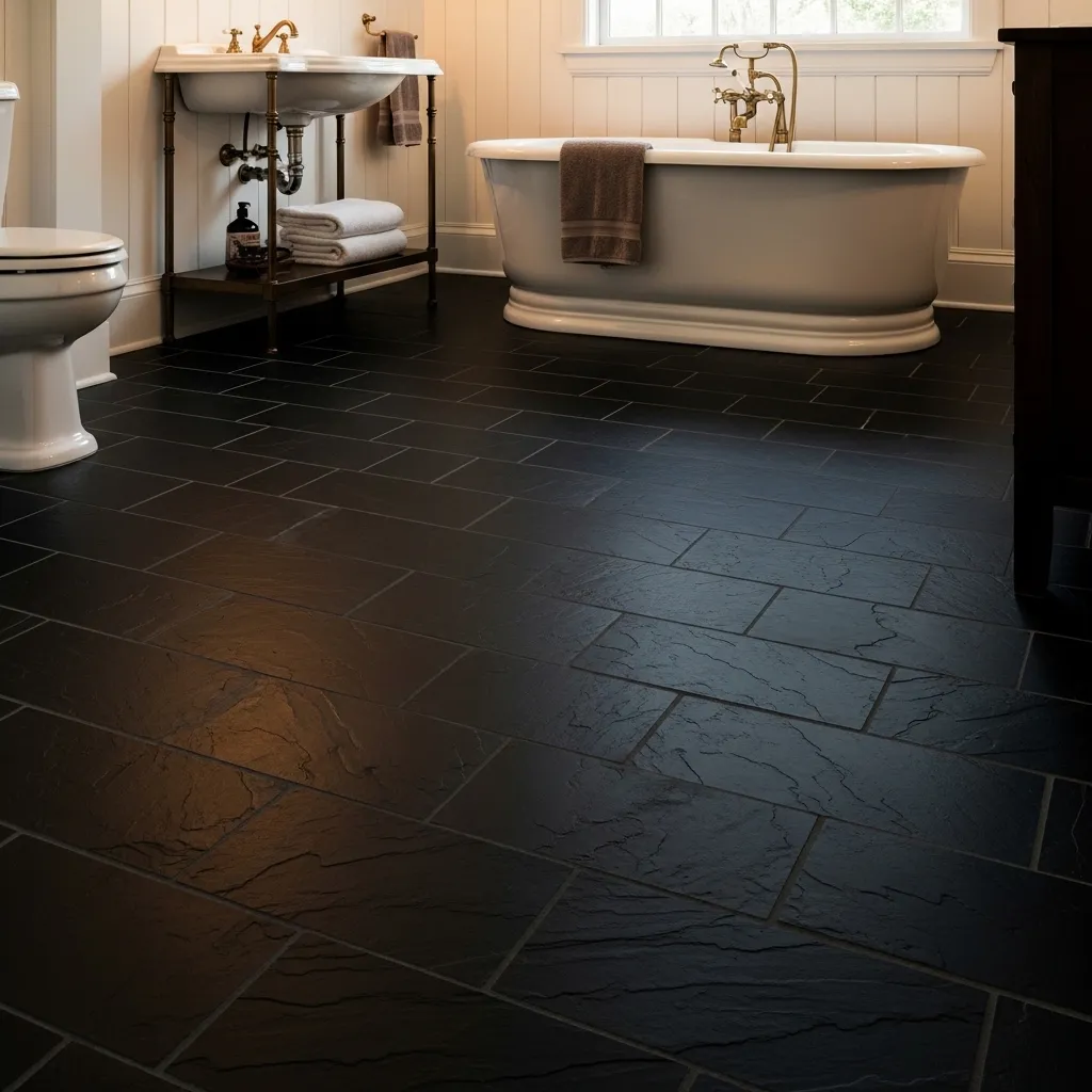 Honed black slate creates the most dramatically grounding bathroom floor available — its deep, warm black anchors the room’s color scheme with a weight and authority that no other floor material quite achieves, while the honed matte finish and the natural variation of the slate surface prevent the darkness from becoming oppressive or monotonous. The slate’s natural cleavage marks and slight tonal variation within the black give the floor visual texture and depth that manufactured black tile, however precisely made, doesn’t provide — black slate is never quite perfectly uniformly black, and that imperfection is what makes it beautiful.