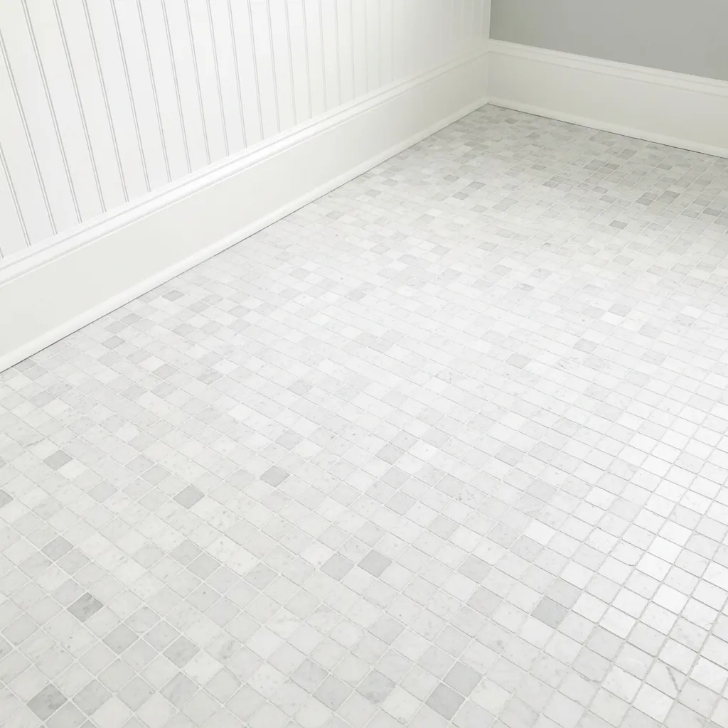 Small-format white marble mosaic is the bathroom floor material experiencing the most significant revival in 2026 — after years of dominance by large-format tile in the name of visual simplicity and easier maintenance, the specific beauty of small-format mosaic is being rediscovered as a floor treatment with qualities that large-format tile simply can’t replicate. The visual complexity of a small-format mosaic floor — visible only at the floor’s scale, where hundreds of individual pieces create a surface of subtle variation and pattern — creates a bathroom floor that rewards the close attention that a bathroom floor receives far more than any large-format alternative.
