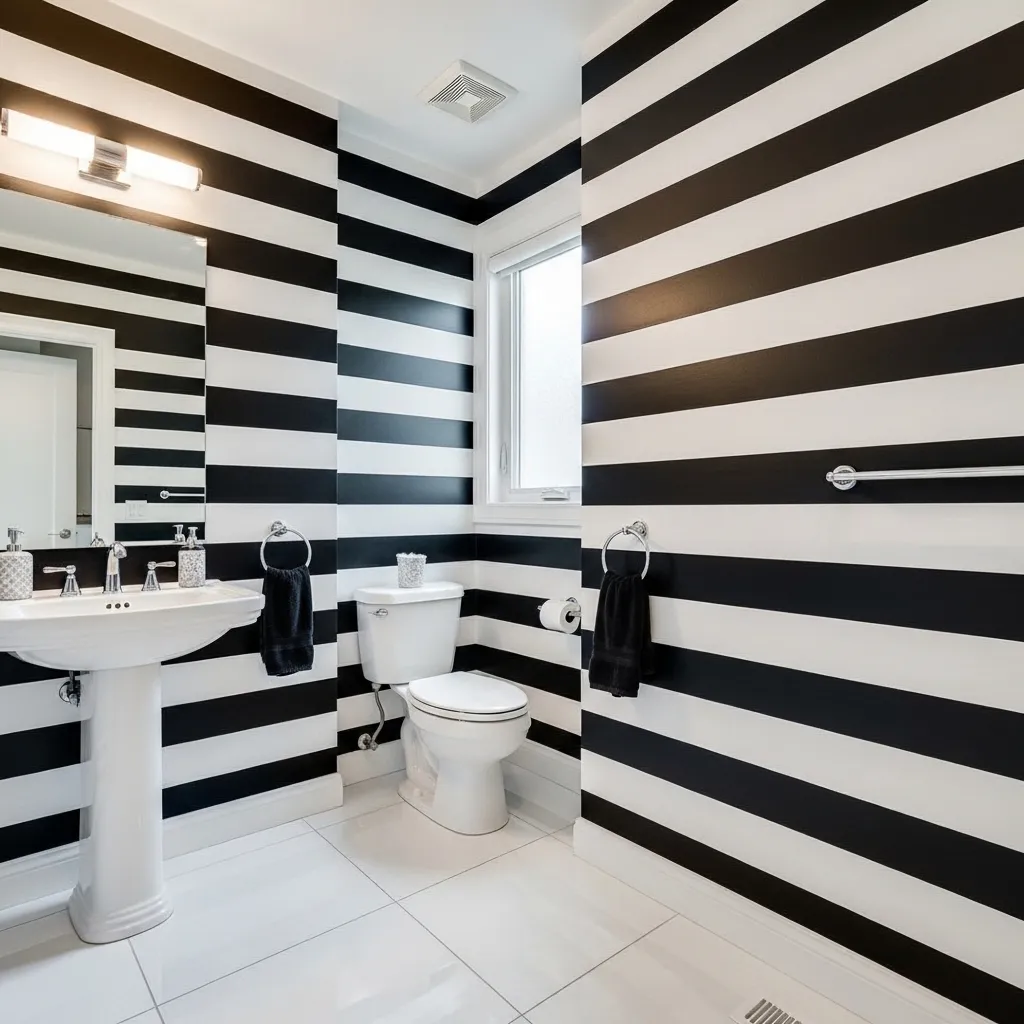 Horizontal black and white stripes create immediate visual impact and make such a bold statement. The strong graphic pattern is energizing and modern, and the horizontal orientation makes bathrooms feel wider. This is not a subtle choice—it’s deliberately bold and eye-catching, perfect for people who want their bathroom to have serious personality and aren’t afraid of commitment to a strong look.