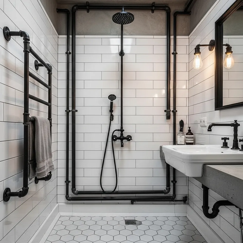 This approach pairs perfectly with white subway tile or concrete-look materials—the industrial vibe comes from the combination of utilitarian materials and honest construction. Matte black fixtures feel more authentic than shiny chrome in this context, and the black metal provides warmth and character that chrome can’t match. This works particularly well in loft apartments, urban spaces, or anywhere you want that edgy, industrial-chic aesthetic. The exposed pipes need to be intentionally planned and properly installed—this only works when it looks designed rather than like rough plumbing left exposed by accident. The white tile provides clean contrast and prevents the industrial elements from feeling too dark or heavy.