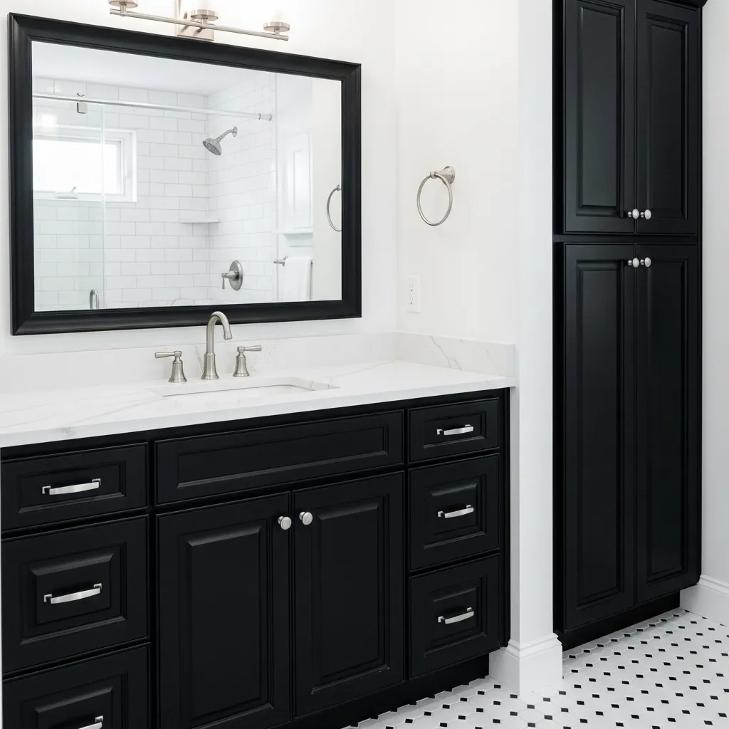 A black vanity creates such a strong, grounded presence in a bathroom and provides that dramatic element without overwhelming the entire space. When topped with a white countertop, you get beautiful contrast right at the focal point of the room—the black provides sophistication and hides the inevitable cabinet scuffs, while the white counter feels clean and bright for your daily grooming routine. It’s the perfect balance of drama and practicality.