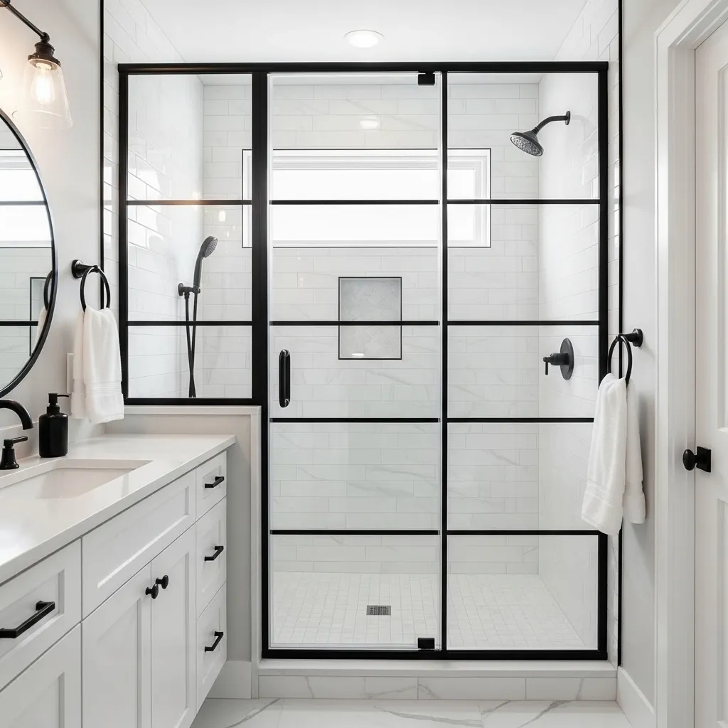 Black-framed shower enclosures have become incredibly popular and for good reason—they create these beautiful graphic lines that add architectural interest and modern sophistication. The black frames reference industrial steel windows and factory aesthetics, bringing that element of authenticity and edge. Unlike frameless glass or chrome frames that try to disappear, black frames make a deliberate design statement.