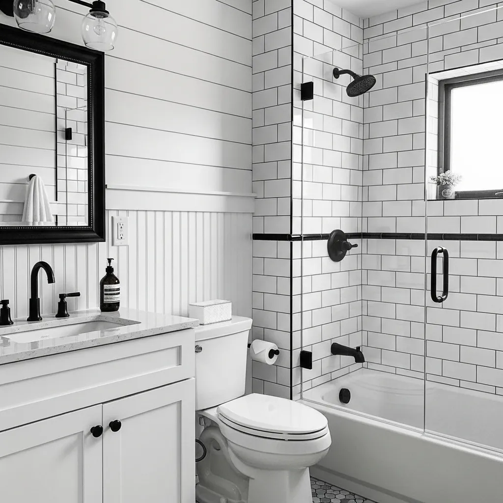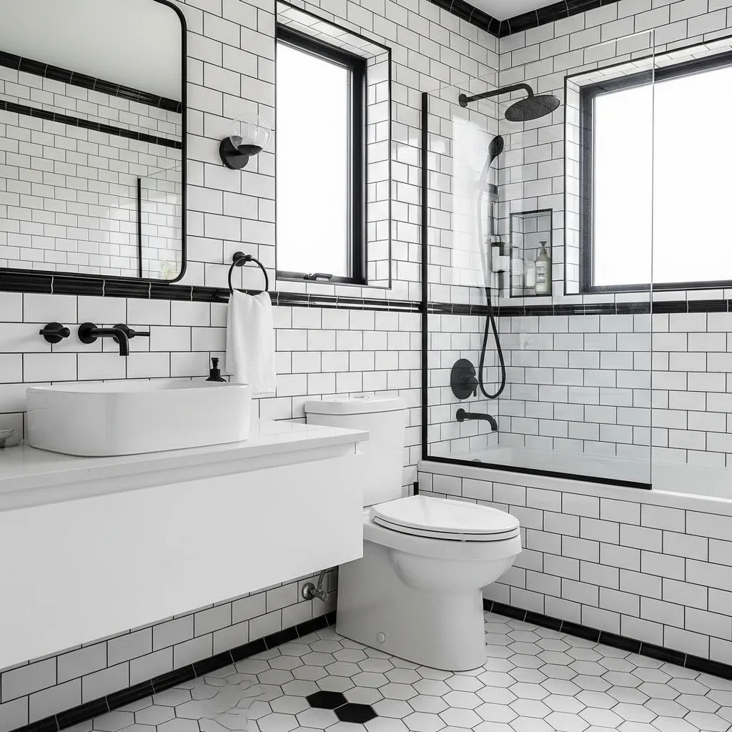 What I love about black and white bathrooms is their incredible range—the same two colors can create completely different moods depending on the proportions you use, the materials you choose, and how you apply them. A bathroom that’s predominantly white with black accents feels crisp, clean, and spacious. One that’s mostly black with white elements feels dramatic, cozy, and luxurious. Equal parts black and white creates bold graphic impact through patterns like checkerboard floors or geometric tile. And the beauty is that you can adjust these proportions to work with your specific space—small bathrooms might benefit from more white to feel larger, while spacious bathrooms can handle more dramatic black elements.