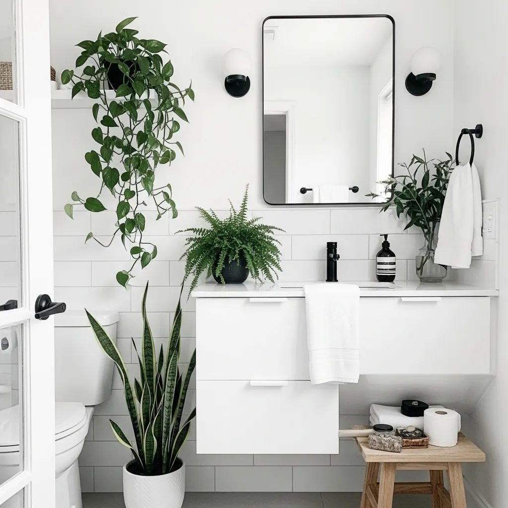 A minimalist black and white bathroom gets such beautiful warmth and life from the addition of plants. The greenery provides the only color in the space, which makes it feel more intentional and impactful—instead of various accent colors competing for attention, you have the clean simplicity of black and white as your foundation with green as the singular organic element. Plants thrive in bathroom humidity and bring life, texture, and that connection to nature that makes spaces feel more welcoming.