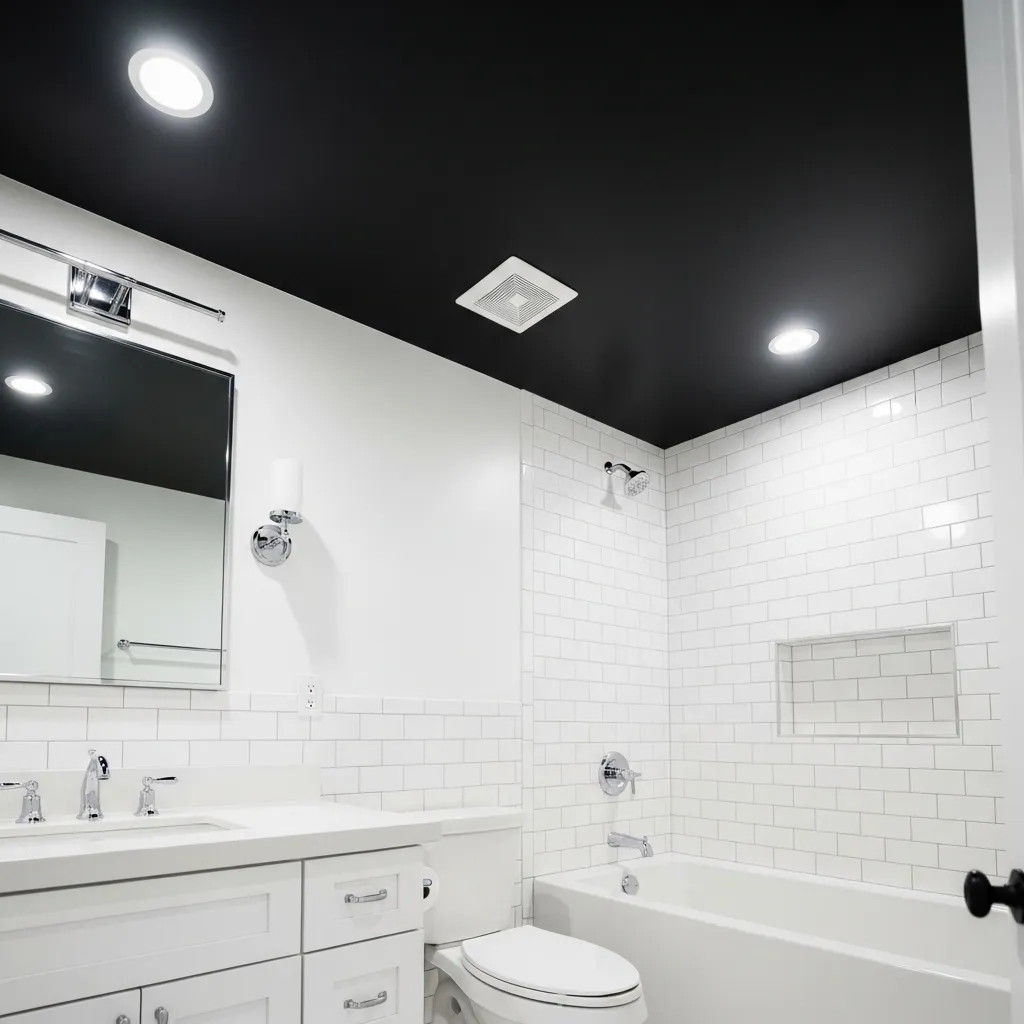 This approach works particularly well in bathrooms with higher ceilings where you want to create a more intimate scale, or in modern spaces where that architectural boldness fits the aesthetic. The lighting becomes crucial and more prominent against the black ceiling—recessed lights create beautiful pools of illumination, and pendant or chandelier fixtures really stand out. Windows provide essential natural light to balance the dark ceiling. The result is a bathroom that feels special and designed without being overly dark or impractical. It’s sophisticated risk-taking that pays off beautifully.