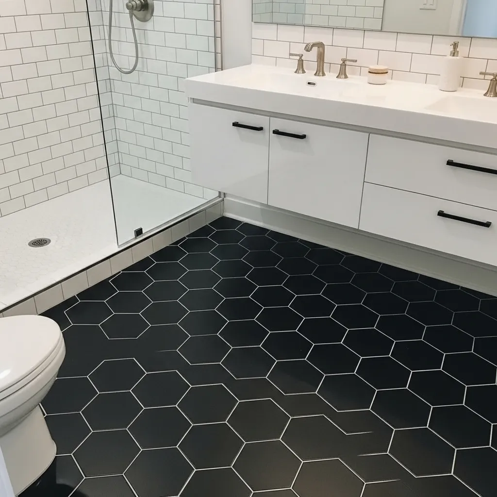 The hexagon shape creates natural movement and visual interest without needing pattern or multiple colors. When paired with predominantly white walls and fixtures, the black floor becomes a dramatic anchor that prevents an all-white bathroom from feeling too sterile or bland. This works across bathroom sizes—in small bathrooms, the black floor creates depth, and in larger bathrooms, it provides visual weight and sophistication. Choose either white grout for strong contrast and graphic impact, or dark gray or black grout for a more subtle, integrated look. The result is a floor that’s both beautiful and incredibly practical for bathroom use.