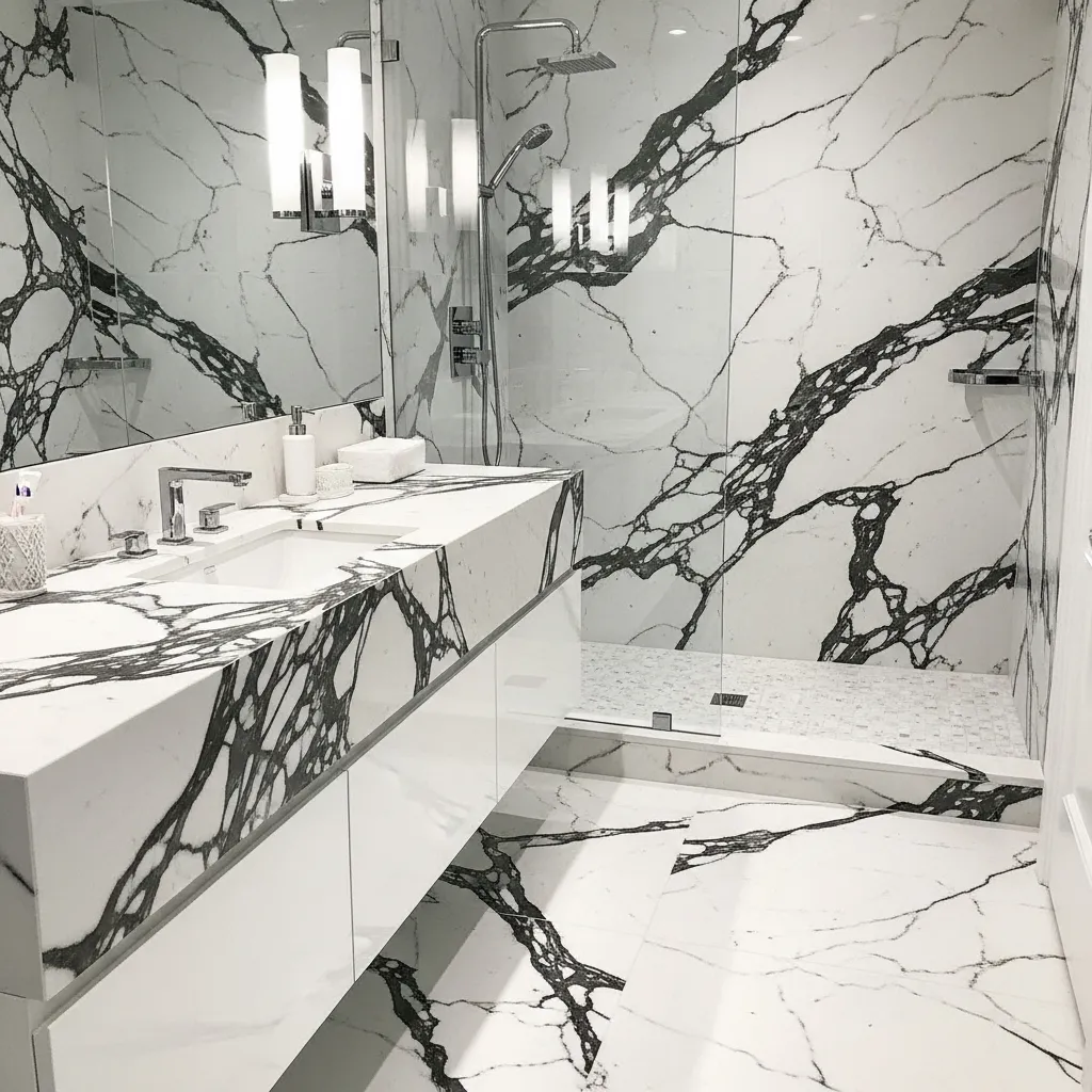 Using marble across multiple surfaces—counters, shower walls, even flooring—creates a cohesive, spa-like environment where the pattern flows throughout the space. Large-format tiles show off the veining better and minimize grout lines for a more seamless look. The organic nature of the veining means every installation is unique—you’re getting a one-of-a-kind bathroom. Yes, marble requires sealing and careful maintenance, but many people feel the beauty justifies the care, or you can opt for marble-look porcelain or quartz that provides the aesthetic with less maintenance. The black veining provides that crucial dark element without needing black fixtures or accessories.