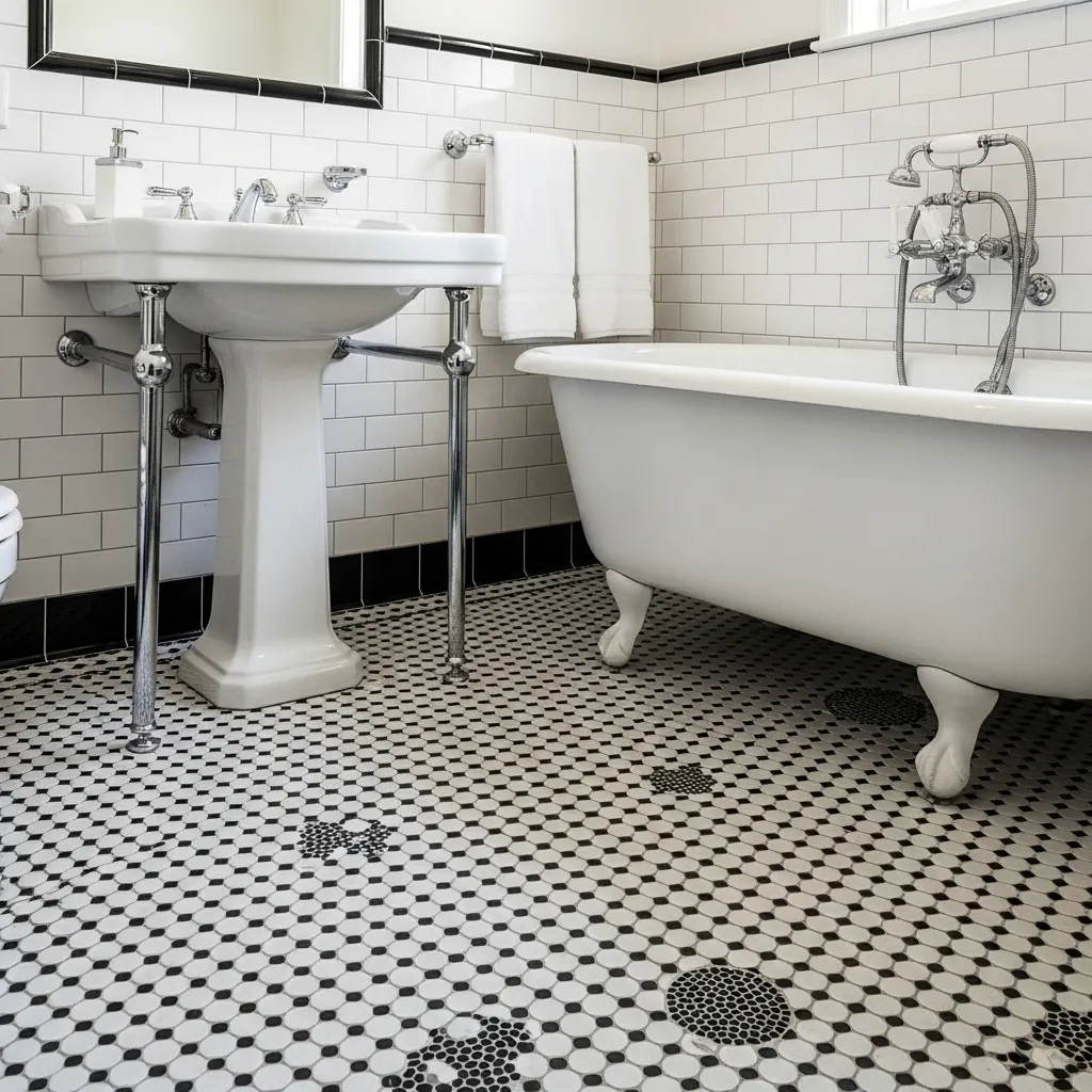 You can use penny tile in all-white, all-black, or mixed patterns—random scattered black tiles throughout white, a border pattern, or geometric designs. The grout color affects the look significantly—white grout creates definition between tiles, while gray grout creates a more integrated appearance. Penny tile works particularly well on shower floors where the small tiles create good traction and proper drainage slopes. Pair it with other vintage elements like pedestal sinks, clawfoot tubs, and subway tile for an authentic period bathroom, or contrast it with modern fixtures for an eclectic mix. The detailed pattern adds significant visual interest and character.