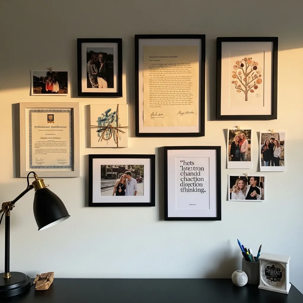 The informal, accumulated quality of a personal achievement gallery — clearly assembled over time as meaningful things arrived rather than designed at once — is precisely what distinguishes it from corporate office decoration and gives it its specific warmth and authenticity. The mix of professional and personal, the variety of frame styles that reflects the variety of occasions from which the pieces came, the evidence of time passing in the different periods the pieces represent — all of these qualities create a wall that tells a genuine story about a specific person rather than performing a generic idea of what an aspirational workspace should contain.