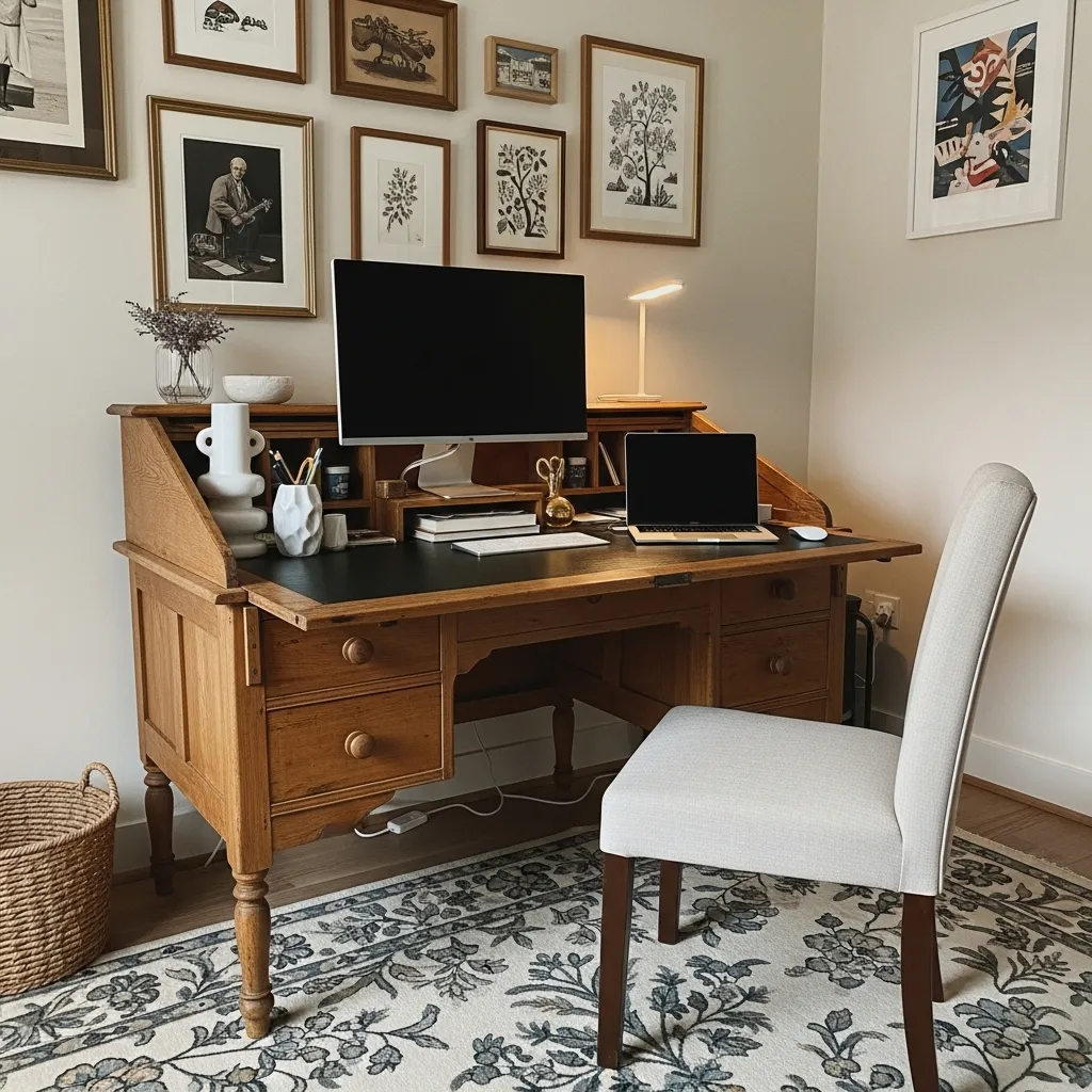 A vintage desk as the primary office furniture piece creates a home office with genuine character and historical presence that no contemporary desk — however well-designed — can replicate, because the vintage desk carries the evidence of previous lives and previous work sessions in its patina, its wear patterns, its specific marks and history. Working at a desk that has been worked at before creates a quality of continuity with the long human tradition of desk work that working at a brand-new flat-pack desk simply doesn’t provide.