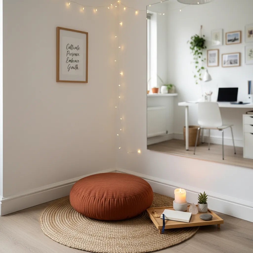 The low cushion on a small rug creates a floor-level space that’s physically and psychologically different from the desk — sitting on the floor, close to the ground, away from the desk and the screen, creates a different quality of awareness and presence that reinforces the distinction between the focused work state and the open, reflective state that meditation and intention-setting require. The separation of the meditation corner from the desk area within the same room creates two distinct zones with different purposes and different qualities, and that zone distinction is what makes the home office a complete working environment rather than just a desk in a room.