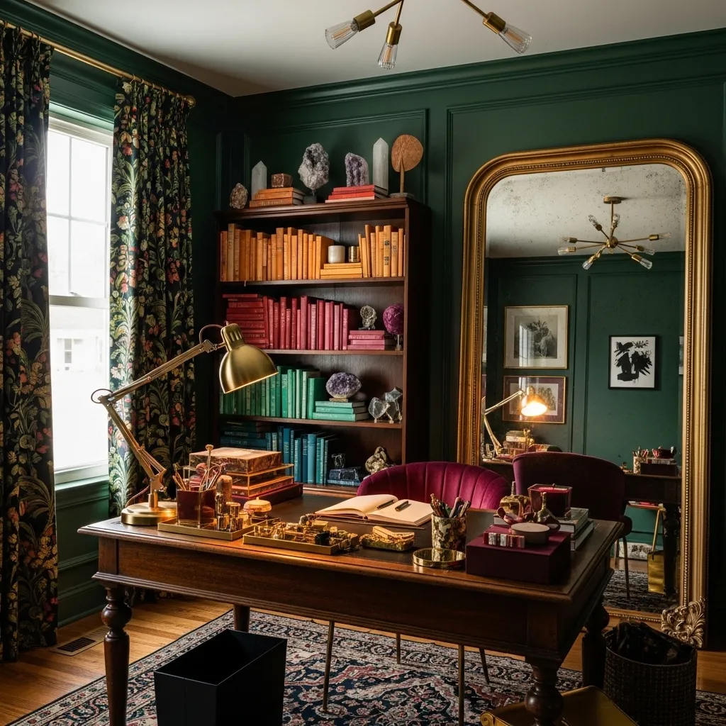 Deep emerald green walls are the specific color choice that works best for a maximalist office because the depth of a dark jewel tone creates a cocoon-like quality of enclosure that supports focused work while feeling luxurious and intentional rather than austere or corporate. The color reads as confident and sophisticated rather than merely bold, and it creates a backdrop against which gold accessories, deep burgundy textiles, and botanical prints all appear more vivid and more beautiful than they would against lighter or neutral walls.