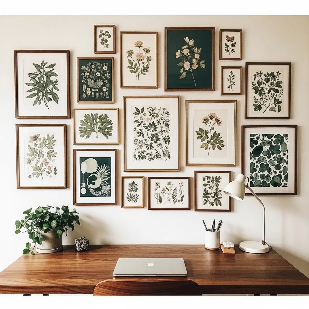 The mix of frame styles within a botanical gallery wall is the detail that makes it feel personally collected rather than purchased as a set — simple gold frames, natural wood frames, the occasional black frame, all in different sizes but sharing a botanical content and a consistent warm-green-and-cream palette. This consistency of content within variety of presentation is the gallery wall principle that creates richness without chaos, and in a home office context it creates a backdrop for work that’s genuinely beautiful to look at while being calm enough to let focus develop rather than demanding attention.