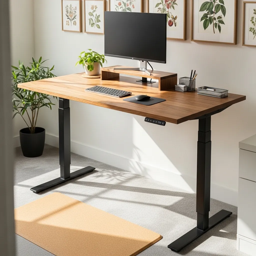 The standing mat in a home office context deserves more aesthetic attention than it typically receives because it’s constantly visible on the floor in front of the desk and it significantly affects the overall visual quality of the workspace. A natural cork mat or a high-quality anti-fatigue mat in a warm neutral tone integrates much more gracefully into a designed office than the standard black foam mat that most standing desks are accompanied by — the warm material continues the natural material story of the desk surface and the office as a whole rather than introducing an incongruous black foam rectangle as the floor’s primary feature.
