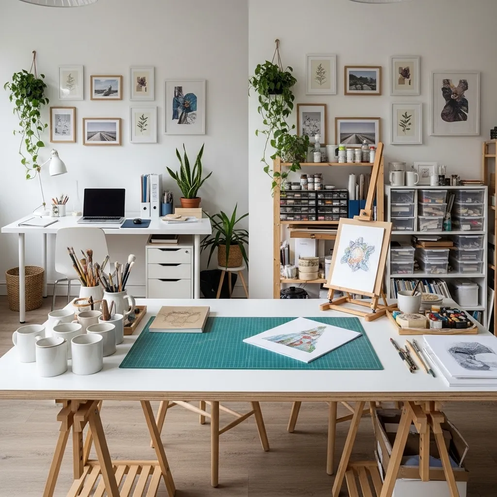 The design challenge of a shared creative and office space is maintaining the clean organization of the professional desk zone while accommodating the productive mess of creative work in the studio zone — which requires genuine spatial separation between the two zones even within the same room. The professional desk should be entirely clear of creative materials, and the creative table should have its own dedicated storage and organization system so that materials don’t migrate to the desk and the desk’s clean working surface doesn’t get compromised by creative overflow.