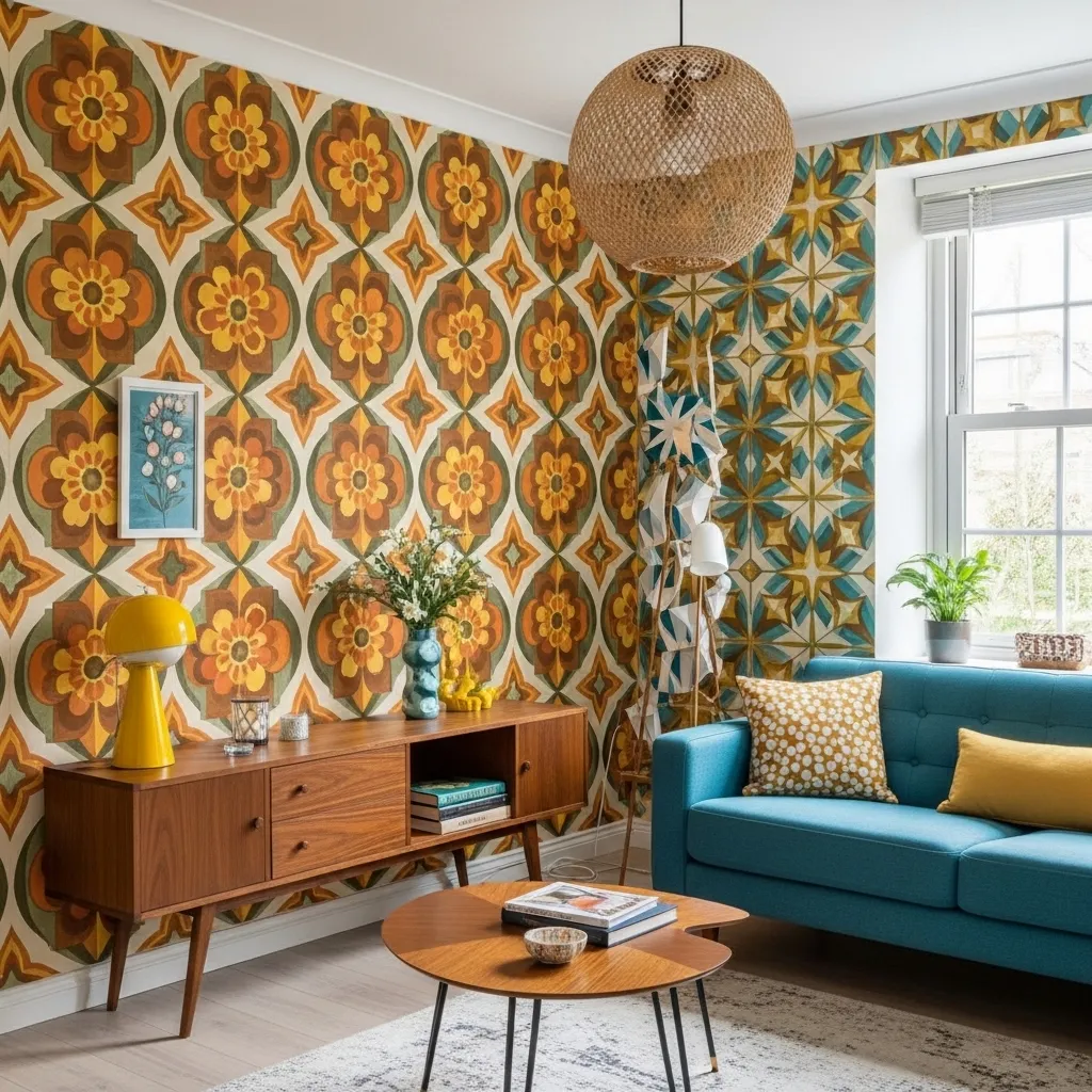 Retro wallpaper brings instant period atmosphere and dramatic visual impact. The bold patterns, distinctive color combinations, and large-scale graphics that characterized wallpaper from the 1950s-80s create unmistakable vintage character. A single wallpapered feature wall can transform an entire room’s aesthetic.