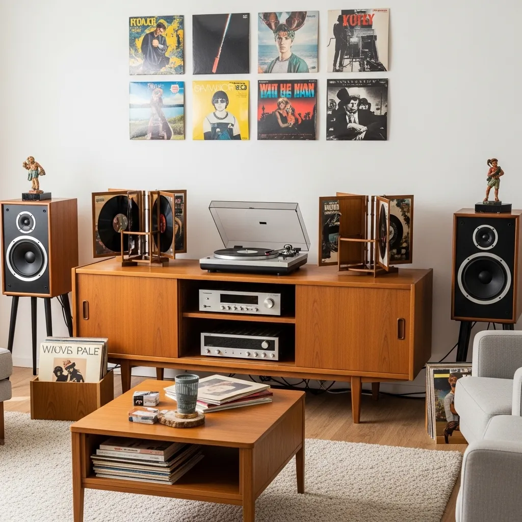The key is creating a complete, functional music station with authentic styling. Source a quality turntable—either restored vintage models or modern players with retro styling. House it in period-appropriate furniture—a mid-century credenza, teak media console, or purpose-built vinyl storage unit. Build or source proper record storage keeping albums accessible and properly stored. Display select album covers as rotating artwork—their large-format graphics are genuinely beautiful. Include period-appropriate speakers or modern speakers with vintage aesthetic. Make the setup functional—this should be your actual music system, not just decoration. Start or expand a vinyl collection—thrift stores and record shops offer affordable vintage albums. The functional record player setup creates authentic retro living while providing genuinely satisfying analog audio experience.