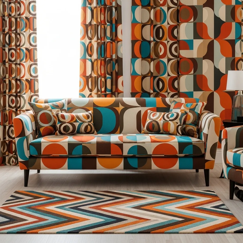 The key is layering geometric patterns thoughtfully without creating chaos. Choose one large-scale pattern for a major piece—perhaps geometric upholstery on the sofa or a bold patterned rug. Add smaller-scale coordinating patterns through pillows, curtains, or accent chairs. Use period-appropriate motifs—overlapping circles, hexagons, chevrons, sunbursts, or abstract geometric compositions. Stick to a cohesive color palette even while mixing patterns—perhaps orange, teal, brown, and cream throughout all patterns. Balance pattern-heavy elements with solid colors—if the sofa is boldly patterned, keep walls and larger furniture pieces solid. The geometric patterns should feel intentional and joyful rather than random or overwhelming. Include authentic vintage textiles if possible—original 1960s-70s fabrics have quality and character that reproductions struggle to match. The bold patterns create the visual energy and optimism that defined the era.