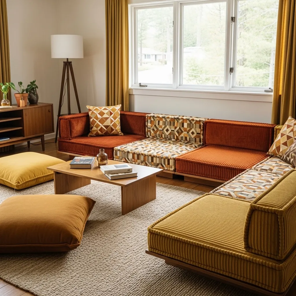 The key is sourcing or recreating low-profile seating and styling it for casual comfort. Find vintage modular sectionals—often available affordably since they fell out of fashion—or source modern low-profile sectionals. Look for minimal leg height, platform bases, or legless designs sitting directly on the floor. Choose period upholstery—velvet, corduroy, or bold geometric fabrics in 70s colors. Arrange modular pieces creating conversation-friendly configurations. Add large floor cushions, poufs, or oversized pillows for supplemental casual seating. Include a low coffee table appropriate to the seating height. Layer with throws and pillows in coordinating retro fabrics. The low-profile seating creates that relaxed, casual 70s atmosphere where formal entertaining gives way to comfortable lounging and intimate conversation.