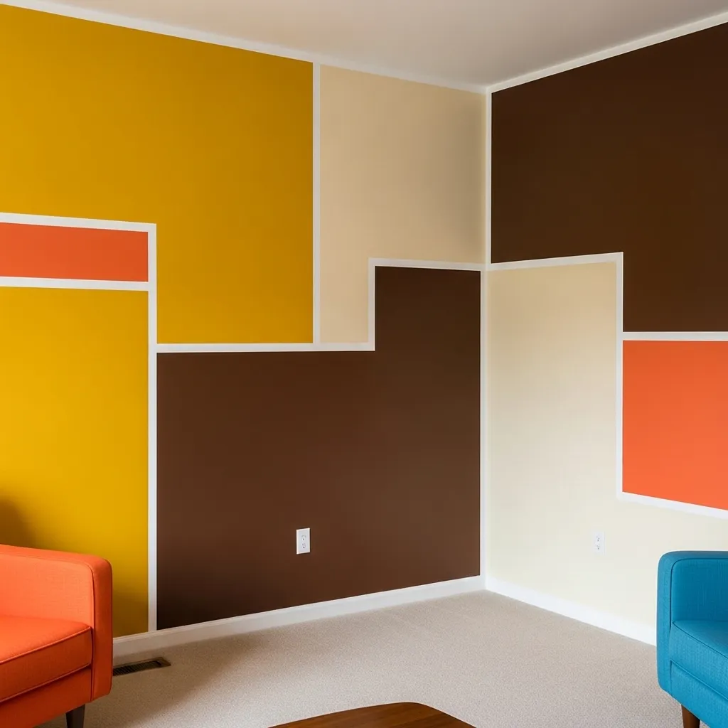 The key is planning thoughtful color blocking that enhances rather than fights your space’s architecture. Choose 2-4 colors from your retro palette—perhaps harvest gold, chocolate brown, rust, and cream. Design geometric divisions—horizontal bands at different heights, vertical sections dividing walls, or asymmetrical shapes creating interest. Use painter’s tape creating crisp lines between colors. Consider color blocking that enhances architectural features—painting alcoves different colors, emphasizing one wall, or creating faux paneling through paint. Ensure adequate contrast between colors so divisions read clearly. Coordinate painted colors with furniture, textiles, and accessories creating cohesive environment. The color-blocked walls create bold, graphic impact characteristic of retro design while providing budget-friendly transformation that can be changed when tastes evolve.