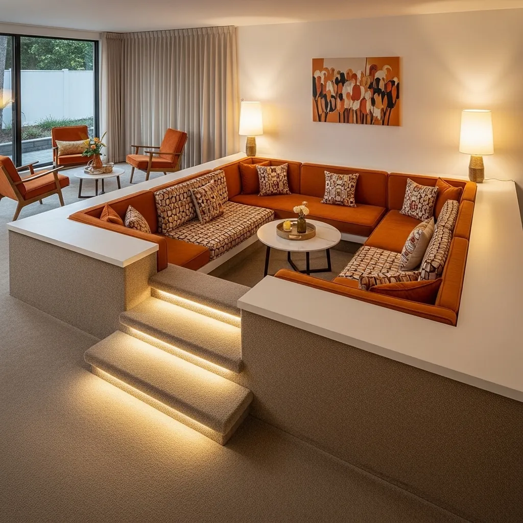 The key is either incorporating an actual sunken area if constructing or renovating, or creating the conversation pit aesthetic through furniture arrangement and styling. For actual construction, drop the floor level 12-18 inches, create built-in seating around the perimeter, and ensure safe step access with proper lighting. Use period-appropriate upholstery—velvet, bold geometric fabrics, or tufted materials in retro colors. Add large floor cushions for flexible seating. For non-structural approaches, arrange low-profile furniture creating an enclosed, pit-like seating area and use area rugs to define the space. Add sunken lighting effects through floor lamps or recessed lighting. The conversation pit aesthetic—whether actual or suggested—creates that quintessential retro gathering space that defined mid-century social living.