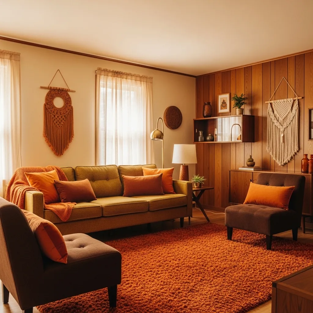 The key is embracing these colors confidently and combining them thoughtfully. Choose one or two primary colors—perhaps harvest gold and burnt orange—and use them prominently in upholstery and textiles. Add deeper browns and rust tones for grounding and depth. Include avocado green sparingly through accent pieces or plants. Use cream or tan walls to prevent the space from feeling too dark while maintaining warmth. Layer the colors rather than using each in equal measure—this creates depth and prevents the palette from feeling flat. Include authentic 70s materials—shag carpeting, wood paneling, brass fixtures—that enhance the period authenticity. The warm earth tones create cozy, nostalgic spaces that celebrate rather than apologize for their 1970s heritage.