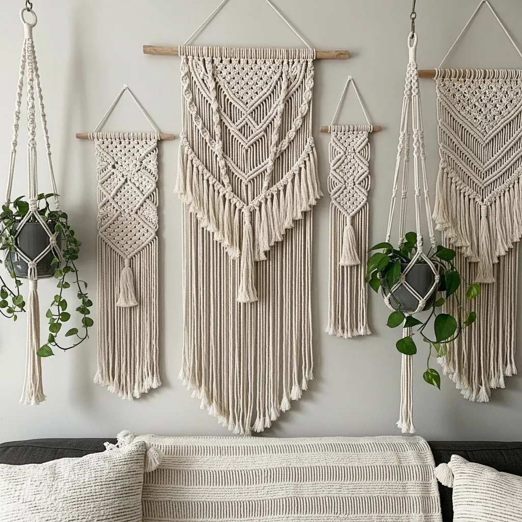 The key is incorporating quality macramé pieces that showcase the craft’s intricacy. Source vintage macramé from thrift stores and estate sales—70s pieces often feature complex knotwork and excellent craftsmanship. Alternatively, support contemporary makers creating macramé in traditional styles, or learn the craft and create your own pieces. Hang substantial wall pieces creating focal points—these should be sizable enough to make impact, not tiny decorative items. Add macramé plant hangers suspending greenery at varied heights. Include woven wall hangings in complementary styles. Choose natural fibers—cotton or jute in cream, natural, or subtle earth tones that work within your palette. Position macramé where its texture can be appreciated and where it balances harder surfaces like wood furniture or painted walls. The macramé creates that essential 70s bohemian texture and celebrates handcraft.