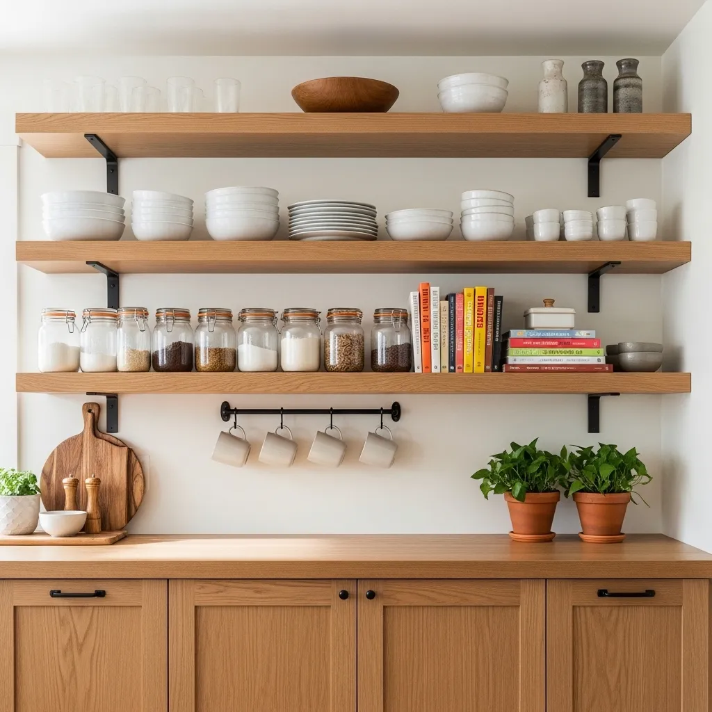 The specific quality of white oak as an open shelving material is that the shelf itself is always visible as the backdrop against which the displayed objects are seen — unlike painted white shelves that recede into the wall, white oak shelves are warmly present as a surface in their own right, and the objects displayed on them are seen against a warm wood backdrop rather than a neutral white one. This means the kitchen objects — the white ceramic dishes, the clear glass jars, the ceramic mugs — appear warmer and more beautiful on white oak shelves than they do on white painted shelves, because the warm wood backdrop enriches their color and material quality rather than simply providing a neutral surface.