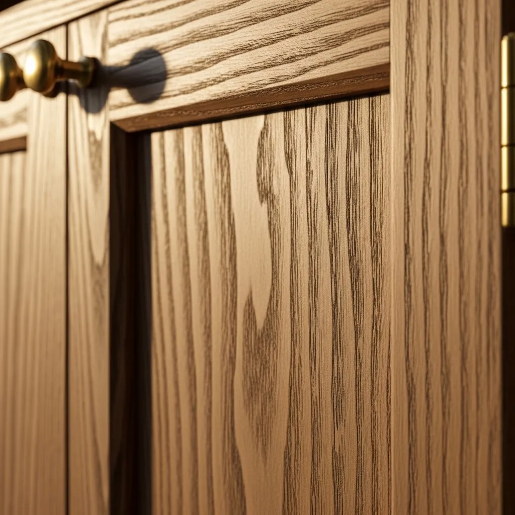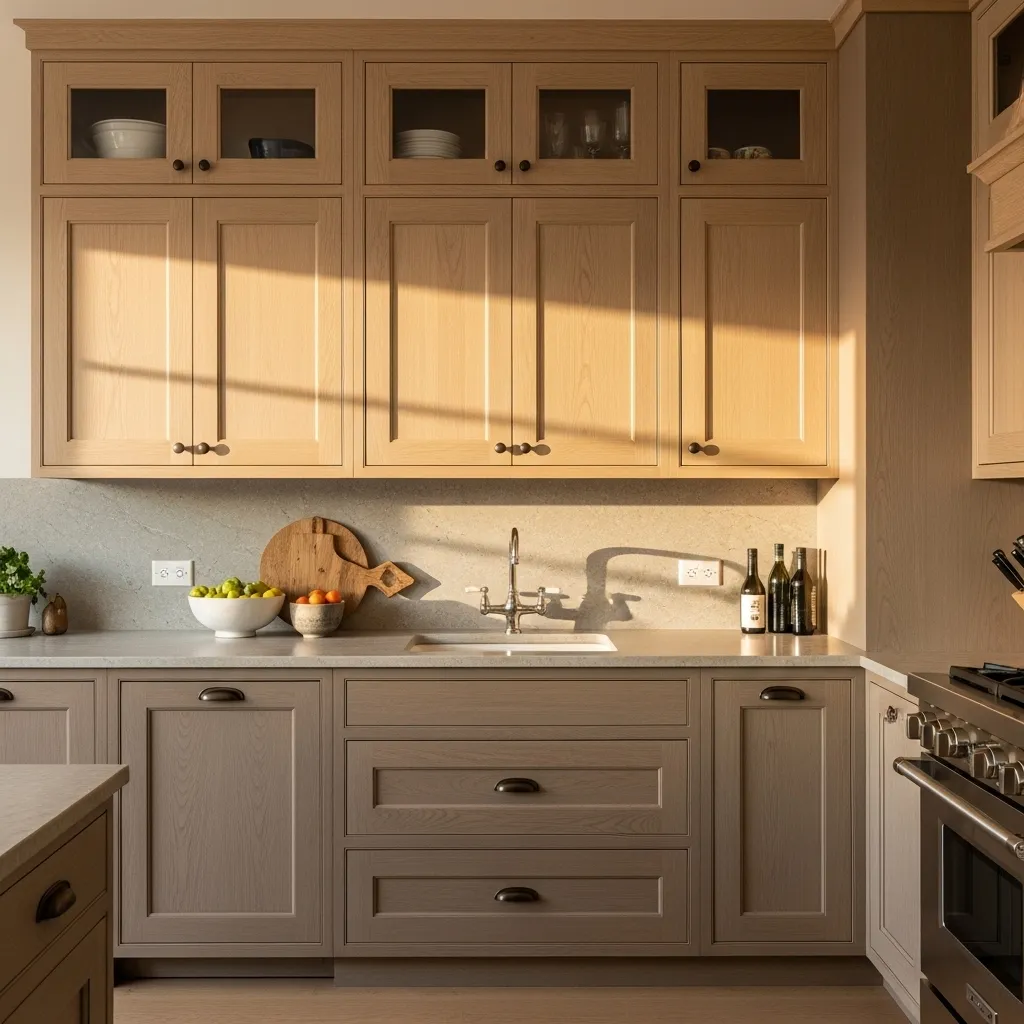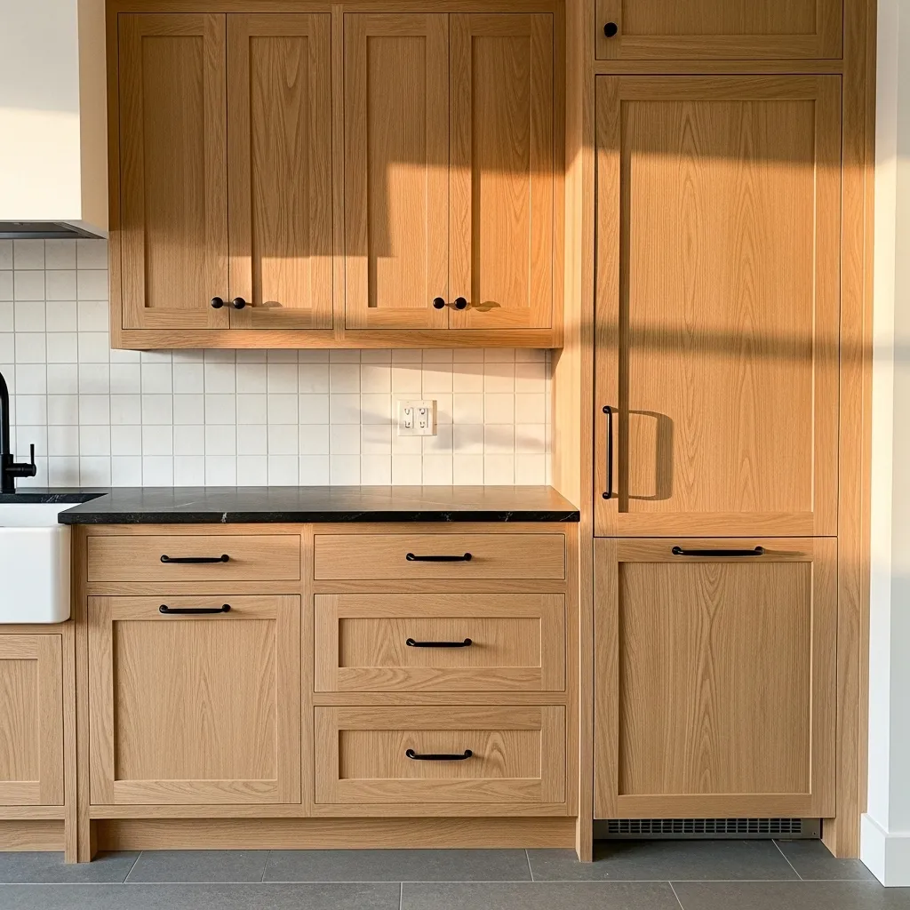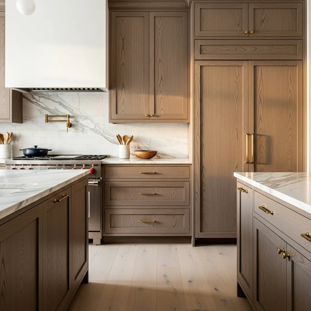 What makes white oak specifically different from other wood species for kitchen cabinetry is the grain pattern — the distinctive ray fleck that appears in quarter-sawn white oak, those beautiful silver-grey rays that run across the grain in longer cuts, creating a surface pattern that’s more graphic and more complex than red oak’s straight grain but more organic and more natural than the cathedral grain of flat-sawn boards. White oak also takes finishing beautifully, accepting everything from raw and natural through wire-brushed to lightly fumed to deeply darkened, which means the same species can produce cabinetry ranging from pale honey warmth through medium warm tan to deep charcoal while always retaining the visual quality of real wood grain. And its specific grey-brown warm tone — neither the orange warmth of pine nor the chocolatey depth of walnut but something more neutral and more contemporary — works with more countertop materials, more hardware finishes, and more overall kitchen palettes than any other wood species.