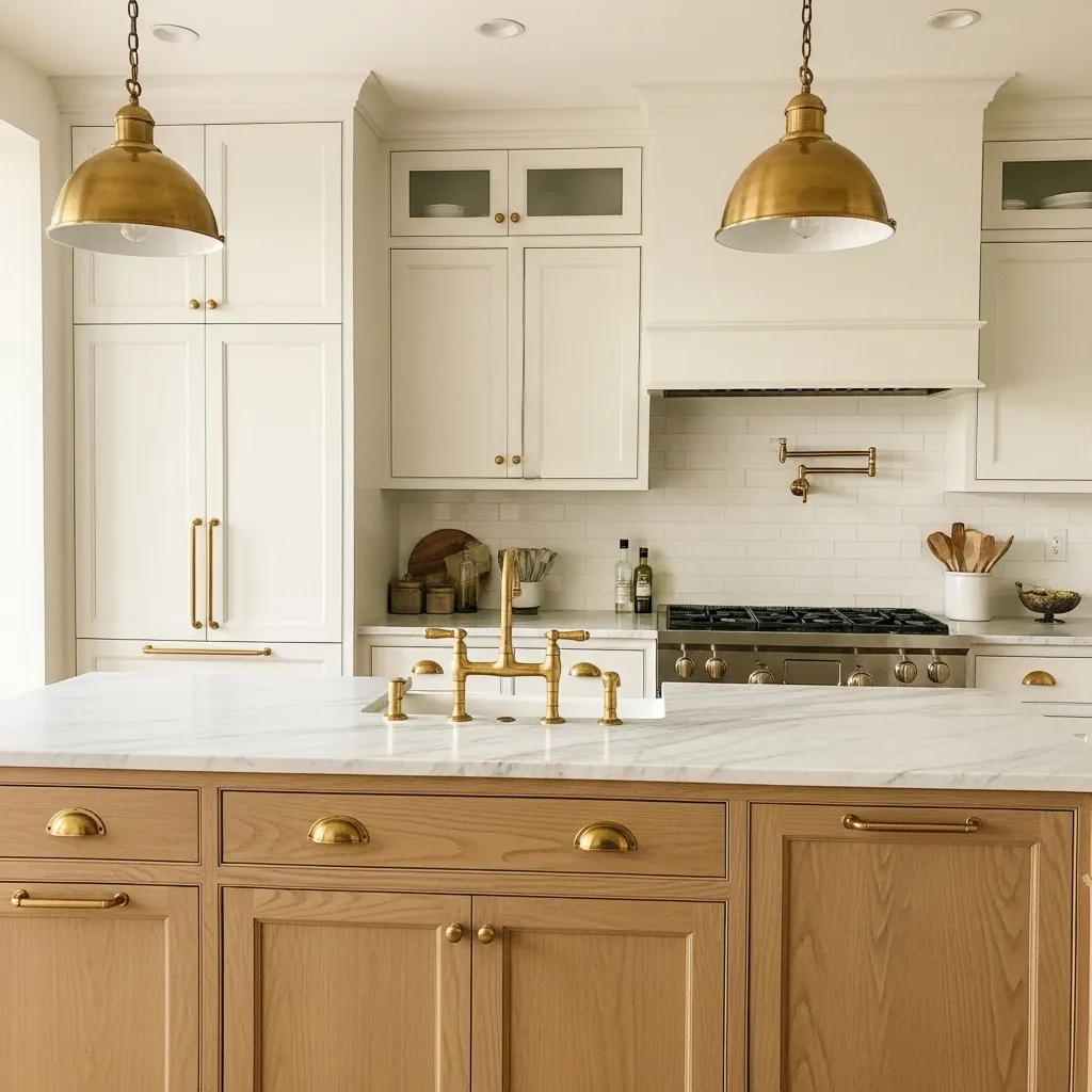 White oak and unlacquered brass is the material combination that most completely and most consistently defines the contemporary natural kitchen aesthetic of 2026 — the warm grain of the oak and the warm amber of the brass speak the same language of organic warmth, with the brass providing the metallic precision and reflective quality that makes the matte wood grain appear richer by contrast. No other hardware finish creates the same quality of warmth and complementarity with white oak — polished chrome is too cool and too hard, brushed nickel is too cool and too restrained, matte black creates beautiful contrast but a different aesthetic character, and satin brass is close but lacks the specific depth and aging quality of unlacquered.